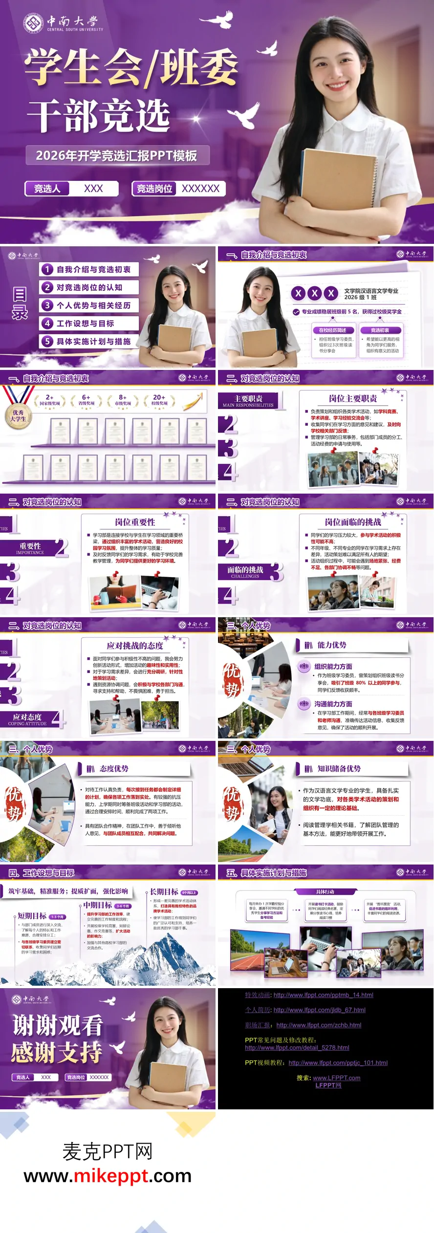 这是一份专为中南大学2026年秋季学期开学季量身定制的竞选汇报PPT模板,采用典雅的紫罗兰色作为视觉基调,整体设计兼具青春朝气与专业质感,高度契合学生会及班委干部竞选场合的庄重与活力并存的特殊氛围。该模板在内容架构上呈现出严谨的系统性,以五大核心模块构建完整叙事链条:开篇以精炼目录统领全局,依次铺陈"自我认知与竞选初心""岗位职责深度解读""核心竞争力与履历印证""战略性工作规划"以及"可操作性落地方案"等关键章节。 在人物画像塑造环节,模板通过学业背景、专业积淀、历年绩点与任职轨迹的多维呈现,配合荣誉奖章可视化矩阵,立体化展竞选者的成长轨迹;岗位认知板块则从职能边界、价值意义、潜在挑战及应对哲学四个层面进行深度剖-析,彰显其前瞻性思维;个人优势提炼聚焦于能力图谱、态度范式与知识储备三大维度,并嵌入具体实践案例作为有力佐证;目标设定层面创造性地构建起"短期破局—中期深耕—长远布局"的三级递进体系,每项规划均配套量化指标与时间节点;尾页以"感谢聆听,期待同行"的恳切表述收束全篇,余韵悠长。整套方案既是个体价值的充分展示,更是责任承诺的庄严宣告,堪称同类场景下的标杆性展示工具。