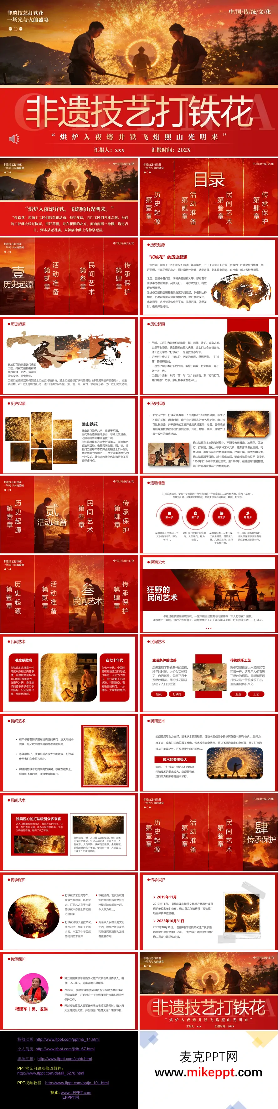 这套PPT以"非遗技艺打铁花——一场光与火的盛宴"为主题,系统性地展示了中国传统打铁花技艺的历史起源、活动准备、艺术特色与传承保护。封面以"烘炉入夜熔并铁,飞焰照山光明来"的诗句点题,奠定恢弘大气的基调。 历史起源部分详细阐释了打铁花源于北宋工匠祭祀太上老君的道教仪式,明清时期鼎盛发展,兼具行业祈福与民间娱乐功能。其中河南确山铁花作为代表性流派,融合炼丹法术与工匠传统,形成独特风格。PPT通过文字与史料结合,展现其从宗教祭祀扩展至喜庆活动的演变脉络。 活动准备章节以分步图解形式说明流程:先搭建象征天地八卦的"花棚",顶部设立绑满烟花的"老杆",随后将生铁熔化为1600℃以上的铁汁。环节设计凸显仪式感与道教文化内涵。 民间艺术板块强调其"狂野与闪耀并存"的特质,通过动态描述展现技艺难度——艺人需全力击打铁水,使其在空中散作星雨。插图生动呈现"火树金花不夜天"的壮观场景,并与现代烟花对比,体现传统工艺的独特魅力。 传承保护部分列举确山县文化馆成为保护单位、杨建军组建表演队等举措,通过传承人肖像与创新案例(如"铁花火龙"),彰显非遗活态传承的成果。全文首尾呼应,以诗境起、以文化意义收束,构建出完整的光影史诗。