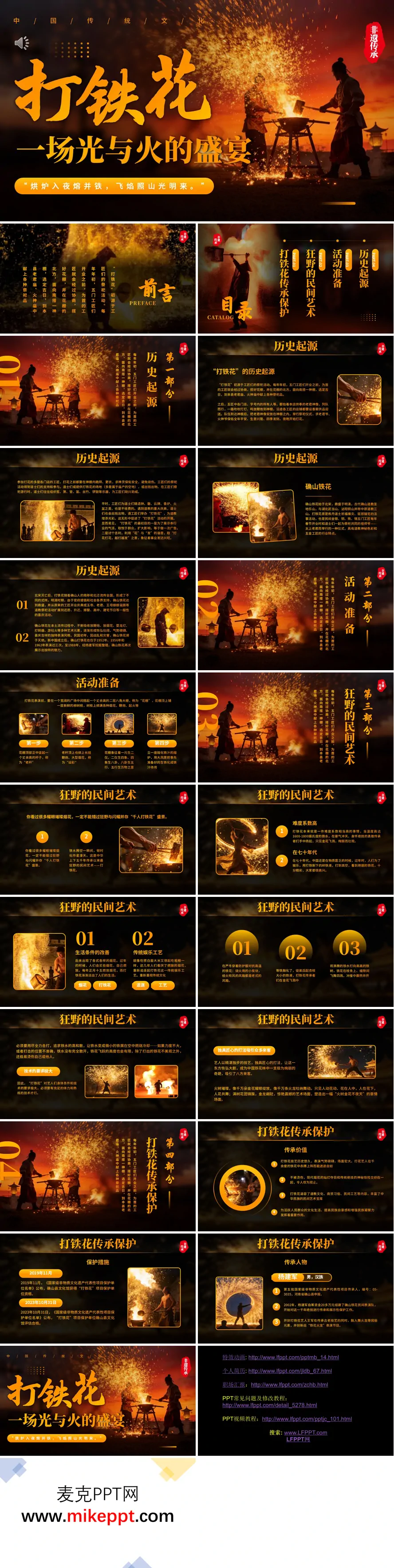 这套PPT图文并茂地展示了中国非物质文化遗产“打铁花”的历史、技艺与传承保护。封面以“光与火的盛宴”点题,配以“烘炉入夜熔并铁,飞焰照山光明来”的诗句,奠定了恢弘大气的基调。 PPT首先通过历史起源部分,说明打铁花源于北宋工匠与道士共同祭祀太上老君的道教仪式,兼具行业气派与祈福寓意。活动准备环节详细呈现了表演前的严谨流程:需搭设象征八卦五行的花棚,棚顶绑柳枝与烟花,并竖立“老杆”设彩。 同时,熔炉化铁为汁,为表演做好准备。 狂野的民间艺术章节突出其技艺难度与视觉震撼——艺人需将1600℃的铁水奋力击打至高空,形成“火树金花”的绚烂景象。PPT强调这种传统娱乐曾因烟花普及而式微,如今又因文化回归重现魅力。结尾部分聚焦保护措施,提及确山县文化馆作为保护单位,并介绍传承人杨建军组建表演队、创新“铁花火龙”等贡献,彰显非遗活态传承的当代价值。整部PPT通过历史脉络、技艺细节与保护实践,完整呈现了打铁花作为民间艺术瑰宝的独特魅力。