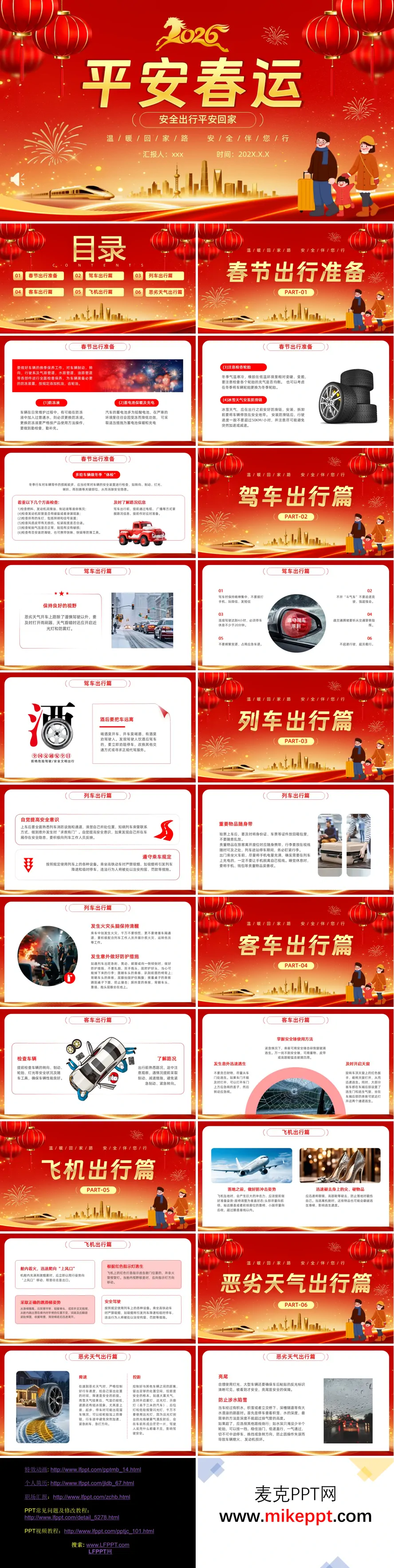 这是一份主题为"平安春运·温暖回家路"的交通安全教育PPT,系统涵盖了春节期间各类出行方式的安全指南。内容分为六个部分: **春节出行准备** 聚焦车辆冬检,包括防冻液更换、蓄电池保暖、轮胎检查及防滑链安装等要点; **驾车出行篇** 强调拒绝酒驾、疲劳驾驶、保持视野清晰及文明驾驶原则; **列车出行篇** 重点讲解高铁禁烟规定、贵重物品保管、火灾应急及列车倾覆时的防护姿势; **客车出行篇** 介绍安全锤使用、天窗及应急门逃生技巧; **飞机出行篇** 详述防冲击姿势、摘除尖锐物品、按红色指示灯逃生及跳滑梯规范动作; **恶劣天气篇** 提出"降速、控距、亮尾"核心原则,并提示涉水陷车应对方法。整套材料通过图文结合形式,为旅客提供全面、实用的春运安全知识。