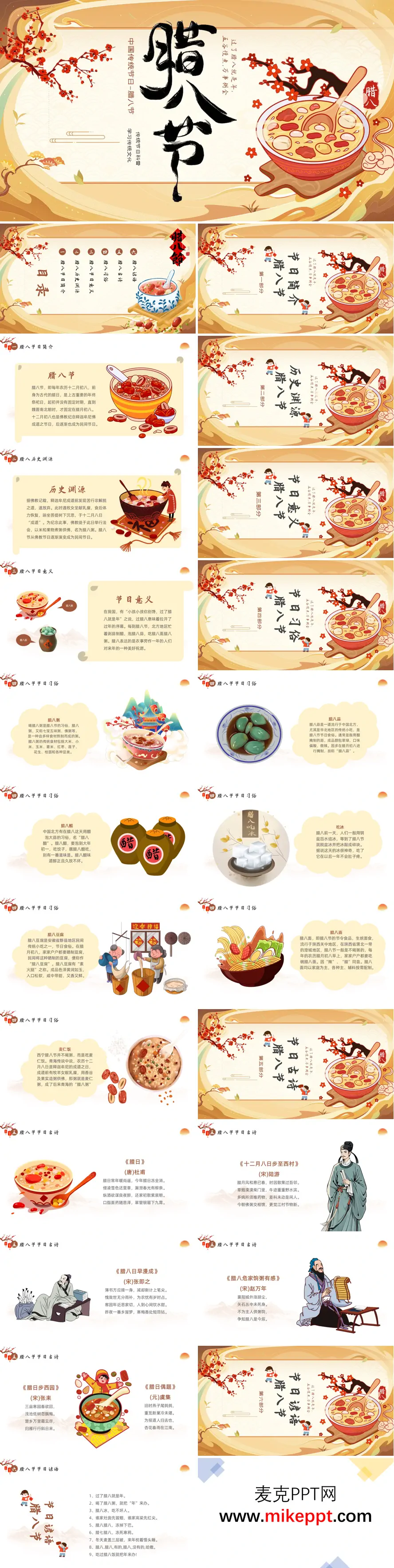 这套PPT以图文并茂的形式,系统介绍了中国传统节日“腊八节”的丰富内容。整体结构清晰,从节日简介、历史渊源、文化意义到具体习俗、相关古诗及民间谚语,全面展现了腊八节的文化内涵。 PPT开篇点明腊八节的时间(农历十二月初八)及其起源:原为上古祭祀日,后受佛教影响,演变为纪念释迦牟尼成道的节日,并逐渐成为民间重要的年节之一。内容突出了“过了腊八就是年”的民俗意义,象征春节序幕的拉开。 在习俗部分,PPT通过多张配图重点呈现了各地特色节俗:北方常见的腊八粥、腊八蒜、腊八醋,安徽的腊八豆腐,陕西的腊八面,青海的麦仁饭,以及一些地区“腊八吃冰”的独特传统,生动体现了饮食文化与地域特色。 最后部分收录了杜甫、陆游等历代诗人的腊八古诗,以及“过了腊八就是年”“腊七腊八,冻死寒鸦”等通俗谚语,进一步从文学与民间智慧角度深化了节日氛围,展现出腊八节连接古今、融合民俗与文化的深厚底蕴。