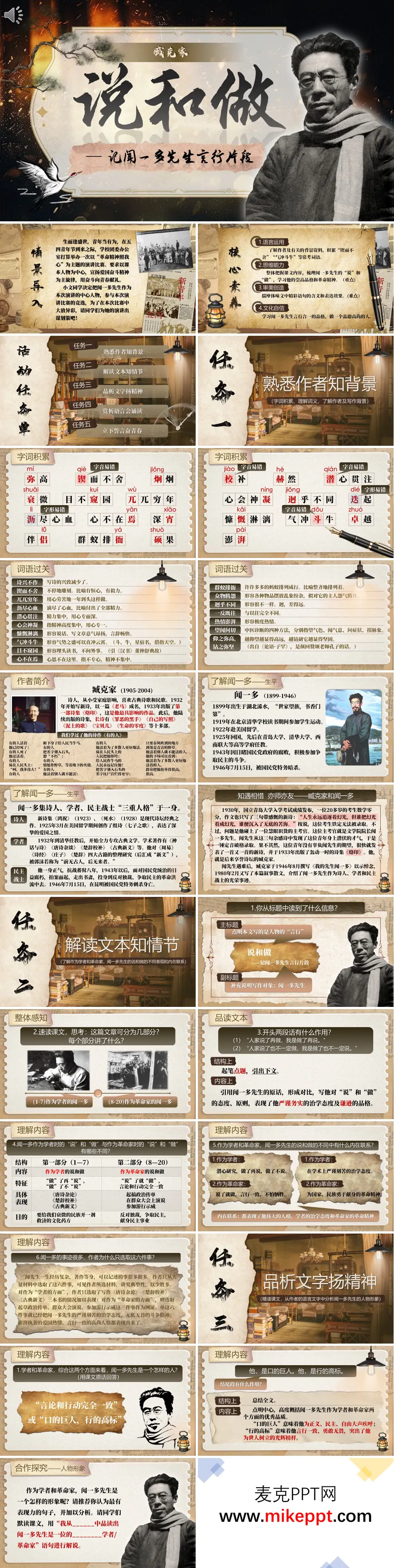 这套围绕《说和做——记闻一多先生言行片段》设计的初中语文教学PPT,以“青春奋斗”演讲比赛为情境主线,将文本解读与表达训练、精神传承融为一体,带领学生在“知背景—析文本—悟精神—写讲稿”的层层任务中,完成从阅读到演讲的完整闭环。课堂以“青年当有为,奋斗正当时”的短片导入,迅速点燃学生热情,并抛出“熟悉作者知背景”“解读文本知情节”等五大任务,明确本课的学习路径。基础热身环节用“时间轴”简介臧克家与闻一多的师生情谊,重点字词“锲而不舍”“沥尽心血”用“雷光电闪”动画逐笔演示,确保读音与释义零误差。文本研读区用“双栏对比图”呈现闻一多的“学者”与“革命家”两种身份:左侧“学者”栏以“目不窥园,足不下楼”等细节,突出“做了再说,做了不说”的专注;右侧“革命家”栏用“说了就做,言行一致”的宣言与行动,配以民主游行短视频,让学生感受“口的巨人,行的高标”的震撼。合作探究环节设置“言行对比表”,学生小组圈画关键词,上台贴标签,教师用“放大镜”赏析“头发凌乱”“声音激动”等外貌与语言描写,引导学生体会“言行一致”的人格力量。语言赏析课后,学生用“青年奋斗”主题词,填写“演讲稿结构云”——开头以闻一多“言行一致”金句设悬念,主体用“对比+细节”凸显精神,结尾发出“青春当奋斗”的号召,完成从文本到演讲的转化。课堂在“奋斗誓言”中落幕:讲台变身演讲台,学生手持话筒,用刚写就的演讲稿讲述闻一多的故事,掌声与背景音乐交织,知识、能力与情感在此实现同频共振。整套设计以“任务驱动—对比研读—细节品析—演讲输出”四环相扣,让闻一多的精神不再停留在文字,而成为激励学生青春奋斗的鲜活力量。