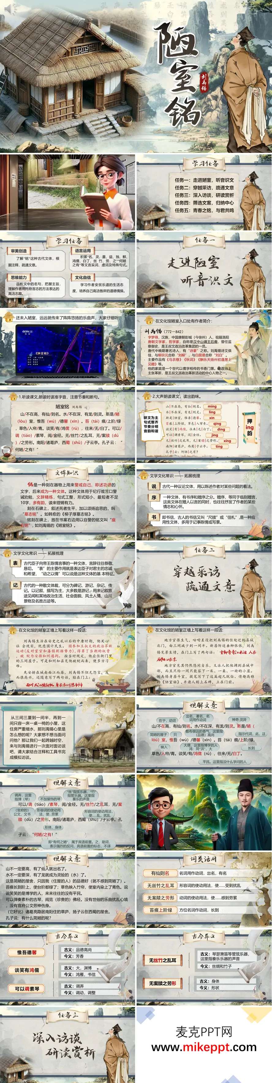 本套PPT课件围绕部编版语文七年级下册第四单元的《陋室铭》展开,共包含38张幻灯片。其核心目标是帮助学生深入学习这篇课文,具体包括掌握文中的重点文言实词及其含义,理解虚词的用法,了解铭文的文体特点。更为重要的是,通过本节课的学习,让学生深刻感受刘禹锡安贫乐道、高洁傲岸的高尚情操,从而树立正确的人生观和价值观。 PPT课件从五个部分展开教学内容。第一部分为“走进陋室”,通过播放视频引出本节课的主题,进而带领学生走进刘禹锡及其《陋室铭》的背景。第二部分是“穿越采访”,旨在引导学生结合课文注释对课文进行翻译,同时帮助学生掌握课文中的重要实词和虚词,为理解文意打下坚实基础。第三部分为“深入访谈”,这一环节聚焦于对课文的研读与赏析,让学生深入理解文章的内涵与艺术特色。第四部分是“筛选文案”,通过归纳总结,帮助学生明确文章的中心思想。第五部分为“青春之铭”,鼓励学生仿照《陋室铭》的格式,写一篇属于自己的青春之“铭”,以此提升学生的仿写能力,同时进一步加深学生对课文的理解和感悟。