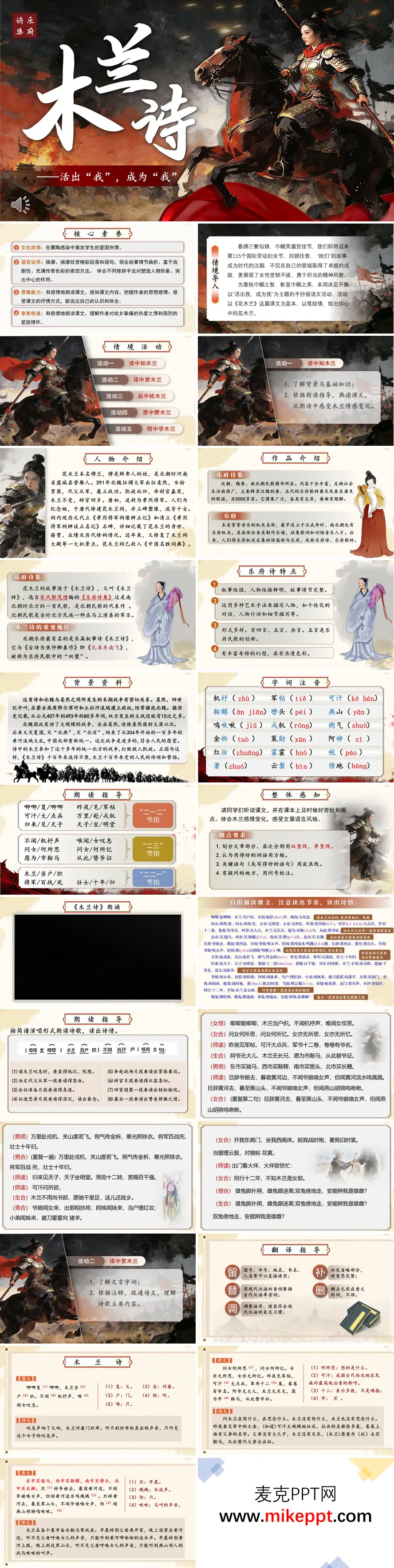 这是一份为七年级语文下册《木兰诗》量身打造的精品教学课件,共66页,以"熟读、精思、活用"为核心理念,旨在引领学生跨越千年时空,与这位巾帼英雄展开深度对话。课程设计紧扣文言文教学规律,既注重夯实语言根基,帮助学生精准掌握重点字词、疏通文意脉络、把握叙事结构,更着力于文化浸润与品格陶冶,让学生在品读中感悟古典诗歌的隽永韵味,在思考中汲取中华传统美德的精神力量。 课件以"五步法"环环相扣,层层推进。首步"诵读识木兰",从人物生平切入,以声情并茂的朗读带领学生初识这位传奇女子,同时聚焦重点字词,扫清阅读障碍,为深入探究奠定基础。第二步"译读赏木兰",引导学生借助注释自主翻译,在字里行间理解诗歌大意,把握故事情节的起承转合。第三步"品读绘木兰",则通过细节推敲、意象品味,引导学生从"替父从军"的孝心、"关山度若飞"的英姿到"对镜贴花黄"的女儿情态,多维度勾勒木兰立体丰满的人物形象。第四步"思读赞木兰",聚焦诗歌铺陈、对偶、排比等艺术手法,带领学生体会北朝民歌质朴而刚健的语言之美,进而抒发对木兰的敬仰与赞颂。末步"悟读学木兰",升华主题,将木兰的忠孝勇义内化为当代少年的价值追求,激励学生在现实生活中传承这份家国情怀与责任担当,实现从文本理解到精神传承的跨越。