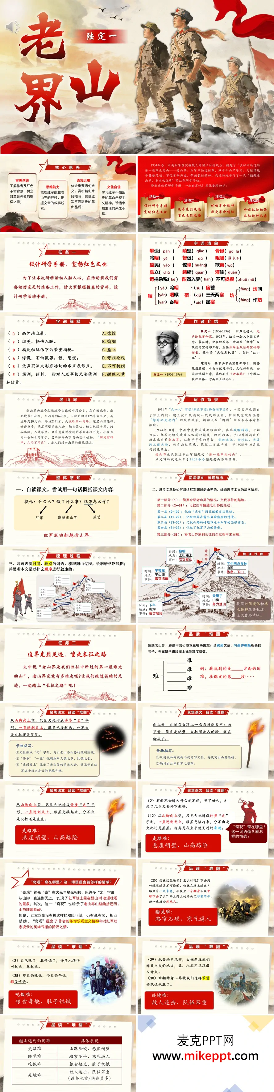 这是一份为七年级语文下册《老山界》量身定制的教学课件,共45页,以"研学实践+文本细读"的双线并轨模式,将红色基因传承与语文核心素养培育有机融合。课程设计立意深远:既引导学生梳理红军翻越老山界的叙事线索,精准划分"星夜出发—山腰宿营—黎明登顶"的情节层次,把握时空交织的叙事结构;又深入鉴赏文中典型环境描写与细节刻画,如"火把如龙"的奇观、"酣然入梦"的反差,理解其渲染艰险氛围、凸显坚韧品格、升华革命主题的表达匠心。更深层的教育旨归在于,让学生在品味"绝壁攀谈""崖边歌声"等动人场景中,真切感受红军战士"风雨侵衣骨更硬"的乐观主义精神与"革命理想高于天"的坚定信仰,进而领悟长征精神中"不畏艰险、勇往直前"的时代内涵,在青少年心中播撒爱国主义的火种,锻造责任担当的品格。 课件突破传统课堂范式,构建"四维一体"的沉浸式学习场域。第一维"研学前置:设计红色手册",将学习延伸至课前,鼓励学生自主搜集长征史料、策划研学方案,在资料整合与任务驱动中厚植情感底色。第二维"路线还原:重走长征之路",依托文本绘制红军行军路线图,于地理空间的还原中直观体验跋涉之艰、意志之坚。第三维"精神叩问:体悟革命情怀",聚焦"山陡路窄""寒气逼人"等极致环境与战士"谈笑凯歌还"的从容姿态形成的强烈对比,引导学生深度感悟红军将士以苦为乐、向死而生的精神境界。第四维"价值传承:呼告长征誓言",以创作激励标语、集体宣誓呼告等形式收束全课,让红色精神在青春表达中落地生根,实现从文本理解到精神内化的价值跃升。