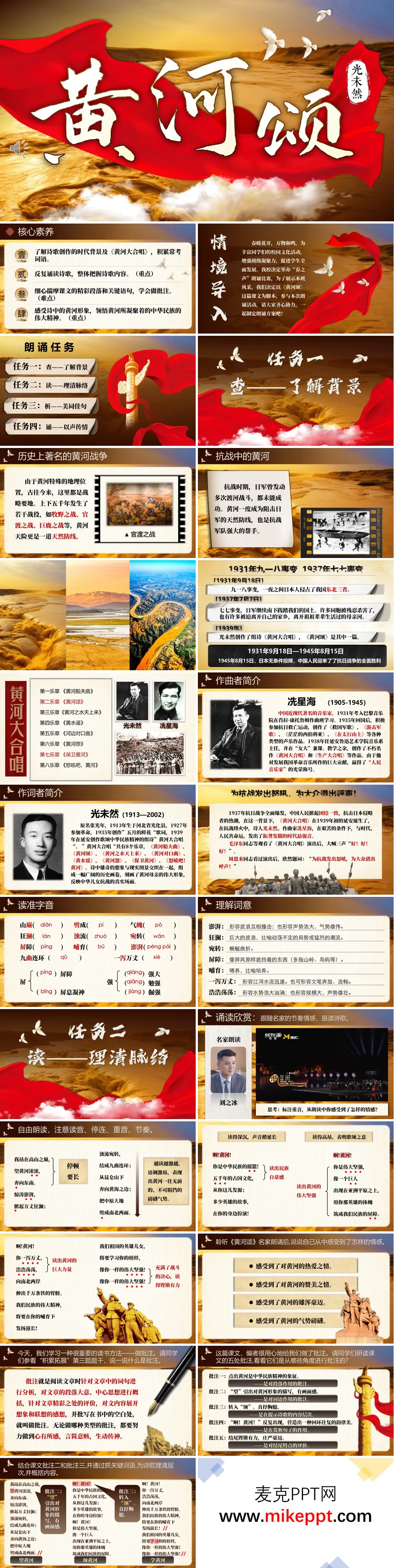 这是一份为七年级语文下册《黄河颂》精心打造的沉浸式教学课件,共47页,以"查、读、析、诵"四环递进式结构,引导学生完成从知识积累到精神共鸣的深度学习之旅。教学目标多维共融:既注重基础知识的夯实,通过精准识记重点字词的字音、字形与词义,构建语言学习的基石;更强调在宏大的时代背景与厚重的黄河文化语境中,情境化地体悟诗歌磅礴的情感洪流,让学生在"黄河之水天上来"的意象中触摸中华民族不屈的精神脉搏,激荡起对祖国壮美山河的深沉爱恋。 课件设计匠心独运,四大部分环环相扣。首环"溯源:走进黄河",以历史纵深视角切入,回眸黄河流域的烽火战事,特别是抗战时期黄河作为精神屏障的特殊意义,同时引领学生走近作曲者冼星海与诗人光未然,在创作者的生命故事里理解作品诞生的必然性。二环"吟诵:把握诗脉",通过名家范读引领、学生情感跟读,在铿锵的节奏与澎湃的韵律中,直观感受《黄河颂》一唱三叹、层层推进的情感波澜。三环"品味:涵泳佳句",以文本细读策略精读全诗,聚焦"惊涛澎湃""万丈狂澜"等极具张力的美词佳句,深度开掘其比喻、象征手法的表达效果,领略诗歌语言撞击心灵的独特魅力。末环"传情:声动人心",将学习成果转化为有声的艺术,引导学生以饱满的激情、恰当的体态语进行朗诵展示,在声情并茂的演绎中实现与诗歌、与黄河精神的心灵共振,让爱国情怀在朗朗诵读声中得到最真挚的抒发与升华。