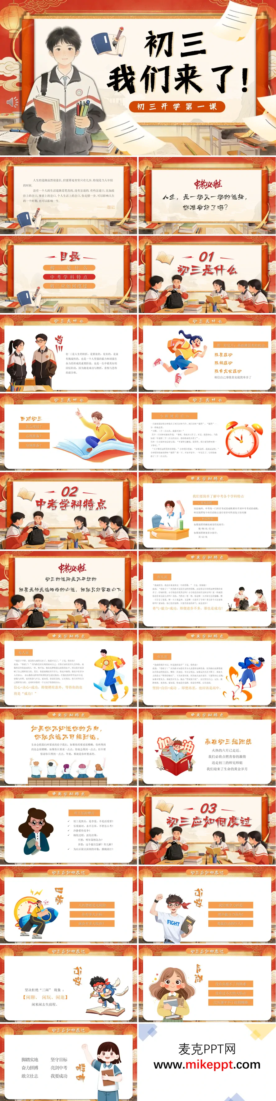 《初三我们来了》主题班会课件共28张幻灯片,围绕初三年级这一关键转折点,从三个维度系统引导学生认识、迎接并投入初三学习生活。课件设计紧扣“唤醒认知—方法指引—行动激励”的逻辑主线,致力于在开学之初为学生注入清晰的方向感与持续的内驱力。 第一部分:初三是什么?——深度认知,明确意义 本环节首先引导学生超越“年级名称”,深刻理解初三的实质内涵。它不仅是初中学习的收官阶段,更是知识体系整合、思维能力跃升和意志品质锤炼的关键期。课件通过直观的数据与事例,凸显初三在衔接高中、奠基未来中的核心地位,促使学生从心理上真正重视起来。特别强调,初三对于基础相对薄弱的学生而言,是一个宝贵的“战略机遇期”——系统复习与针对性强化为此提供了显著的提升空间。同时,它要求学生做好全面准备:不仅是学业上的,更是心理上与状态上的,从而以积极而审慎的姿态拥抱挑战。 第二部分:中考学科特点——把握规律,高效复习 此部分旨在带领学生概览中考主要学科的考查特点与复习规律。课件对各学科的知识结构、能力要求、常见题型及命题趋势进行简明梳理,帮助学生跳出零散知识点,建立“学科地图”意识。其核心目的是引导学生认识到:有效的学习需“因科制宜”,根据文理科、能力考查侧重点的不同,灵活调整学习策略与时间分配。此外,本部分巧妙穿插数则励志故事与往届学生逆袭案例,将方法指导与信心建设融为一体,让学生相信:在正确方法的指引下,取得进步是可期的,从而缓解畏难情绪,点燃奋斗希望。 第三部分:初三应如何度过?——激发潜能,行动为王 这是班会的升华与落脚点。课件首先传递一个核心理念:人的潜能远超自我预设,其释放程度往往与目标的高度和行动的强度成正比。通过设定清晰、可分解的目标,学生能将模糊的焦虑转化为具体的路径。接着,课件以鲜明态度强调行动准则:初三的宝贵时光容不得丝毫懈怠,必须坚决摒弃“三闲”(闲聊、闲玩、闲逛),将主要精力聚焦于有计划的复习、反思与提升。最后,通过营造“一起战斗”的集体氛围与未来展望,极大程度地激发学生的责任感与荣誉感,鼓励他们以坚定的决心、科学的方法和持之以恒的努力,铸就无悔的初三征程。 整场班会设计,环环相扣,情理并重,既提供了清晰的认知框架与实践指南,更着力于营造积极向上的集体心理场域,力求在开学之初便为学生注入一剂强有力的“心理疫苗”与“行动燃料”,助力他们自信、从容、坚定地喊出:“初三,我们来了!”
