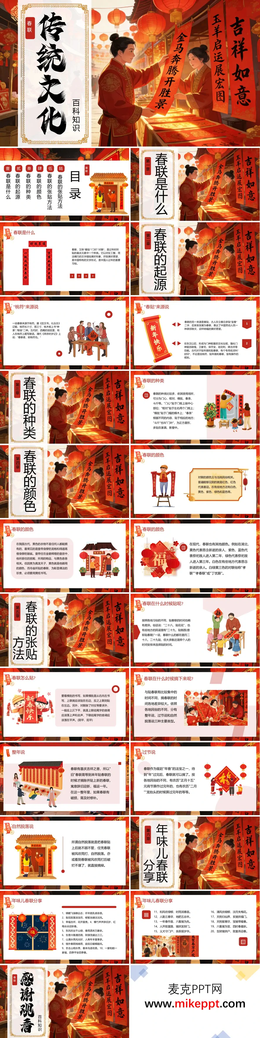 本次“春节对联习俗文化”主题PPT课件,旨在通过系统、生动的展示,引领学生深入了解春联这一承载着深厚历史文化底蕴与传统民俗情感的独特艺术形式。全套课件共包含二十四张幻灯片,内容翔实,结构清晰,围绕六个循序渐进的章节展开,从定义溯源到种类辨析,从色彩意蕴到张贴规范,力求全方位、多角度地展现春联文化的丰富内涵。 课程伊始,第一部分“春联是什么?”将作为开篇,直接切入主题。本部分旨在为学生建立一个清晰的核心概念,通过对春联基本定义的阐述——例如其作为写在纸、布上或刻在竹木、柱子上的对偶语句,于春节时张贴用以抒发美好愿望的文学形式——引出本次文化探索之旅的主题,激发学生的好奇心和求知欲。 紧接着,第二部分“春联的起源”将带领学生追溯历史长河,探寻这一习俗的根脉。课件将引用《后汉书•礼仪志》等经典文献中的相关记载,讲述从先秦时期的“桃符”驱邪避祸,到五代后蜀主孟昶题写“新年纳余庆,嘉节号长春”这一公认首副春联的演变过程。通过了解其从辟邪物到庆贺新年辞章的嬗变,学生能够深刻体会春联如何融合了古代信仰与文学艺术,最终形成固定年俗。 明了起源后,第三部分“春联的种类”将展示其应用上的多样性。本环节将依据使用场所和形式,详细分类介绍:张贴于门板中心的“门心”、置于左右门框的“框对”、悬于门楣的“横批”、内容灵活的单联“春条”、以及菱形方块的“斗斤”等。同时,讲解不同内容的春联(如寓意吉祥、祈愿丰收、行业特色等)与相应张贴位置(大门、厅堂、厨房、店铺等)的匹配关系,体现其与日常生活场景的紧密融合。 春联不仅形式多样,其色彩也蕴含独特的地域文化密码。第四部分“春联的颜色”将深入探讨这一视觉元素。在普遍认知的象征喜庆、吉祥的红色主流之外,课件将介绍一些地方特有的习俗:例如有些地区守孝期间使用白色或黄色春联,以表达哀思与对传统的恪守;紫色春联可能在某些情境下象征祥瑞。通过对色彩多样性的了解,学生能认识到春联习俗并非千篇一律,而是与各地民俗息息相关,体现了中华文化的多元一体。 了解文化内涵后,第五部分“春联的张贴方法”将聚焦于具体的实践规范。本部分将详细讲解张贴的正确方位、上下联的区分方式(通常通过平仄、内容因果关系等)、以及横批的对应位置等关键细节。这些看似微小的规矩,实则蕴含着传统文化中对对称、秩序和美好寓意的讲究,是年俗仪式感的重要组成部分。 最后,第六部分“年味儿春联分享”将作为课程的升华与实践延伸。此环节可以展示古今经典春联范例,赏析其精妙的对仗、优美的书法和丰富的寓意;也可以鼓励学生分享自己家中或见过的特色春联,甚至尝试进行简单的创作或诵读。通过分享与互动,将课堂所学的知识转化为对“年味儿”的切身感知,让学生在实践中进一步感受春联所承载的祝福、希望与传统文化的生命力。 总之,本套课件从知识到应用,从历史到当下,构建了一条完整的春联文化认知路径。它不仅传授关于春联的具体知识,更致力于引导学生领略这一习俗背后的历史深度、艺术美感与民俗情感,从而增强对中华优秀传统文化的认同与热爱。