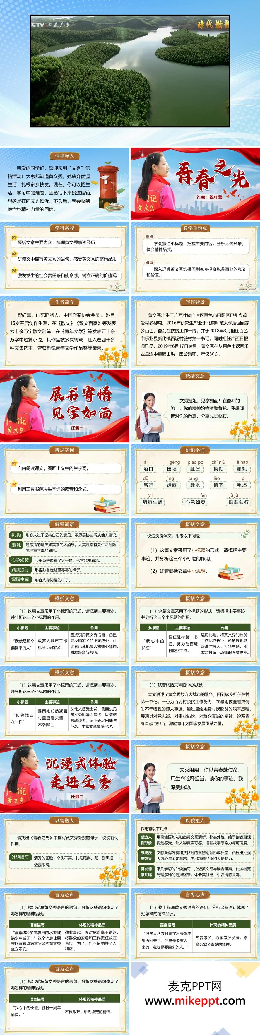 这套专为七年级下册语文部编第四单元《青春之光》设计的演示文稿共37张,整堂课以“活动—体验—升华”为主线,教师综合运用自主阅读、小组合作、角色扮演等多种方式,层层递进地引导学生走进文本:先让他们在静读中捕捉情感脉搏,再在小组碰撞中梳理表达技巧,最后通过分角色朗读与情景再现,把黄文秀“逆行而上”的青春抉择演“活”,使课堂成为情感流动的“青春剧场”。为了让学生与人物跨越时空对话,教师精心创设了“百色山村暴雨夜”的沉浸式情境,配合山洪爆发的新闻短片、黄文秀生前工作照与手绘路线图,视听双线并举,让“青春之光”从文字变成可触可感的温度,从而在心里埋下“担当”的种子。 演示文稿分四大板块有序推进。第一板块“光影初印象”以3分钟微视频开场,用“扶贫书记的一天”快闪镜头迅速聚焦学生注意力,随后抛出“如果你是她,会如何选择”的思辨话题,点燃探究热情;紧接着用时间轴形式梳理黄文秀从“北师大硕士”到“驻村第一书记”的成长轨迹,为深入文本奠定情感基调。第二板块“字里行间寻光芒”依次呈现作者介绍、写作背景与重难点提示,用“关键词云”动态突出“青春、抉择、担当”等核心词,帮助学生带着问题意识进入文本。第三板块“任务驱动悟精神”设置五项连贯任务:先以“拆解题名”活动让学生用“青春+光”的公式预测内容,再通过“生字词快闪赛”夯实基础,接着用“思维导图”梳理情节脉络,随后以“写给黄文秀的一封信”进行角色移情,最后以“青春接力棒”宣誓活动,把个人理想与时代责任对接,完成价值内化。第四板块“点亮青春收束提升”用“一句话收获”接龙回顾课堂,教师升华:“青春之光不在远方,就在每一次选择里”,并分层布置作业:基础层整理本课成语与修辞,提升层拍摄1分钟“我的青春担当”短视频,拓展层阅读《黄文秀日记》并写读后感,让课堂余波继续荡漾,激励学生把仰望星空的热情转化为脚踏实地的行动,争做下一个“发光者”。