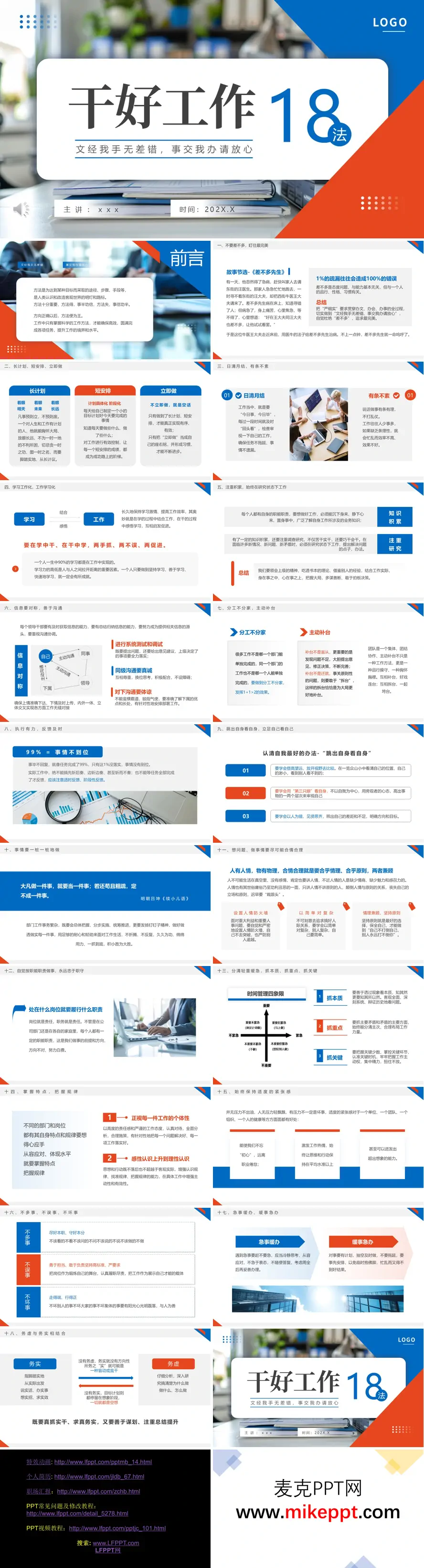 这套PPT以“千好工作18法”为主题,围绕“文经我手无差错,事交我办请放心”的核心精神,系统总结了提升工作效率与质量的实用方法。内容涵盖工作态度、计划执行、学习积累、沟通协作、自我管理等多个维度,旨在帮助职场人员培养严谨、高效、负责的职业习惯。 PPT从“不要差不多,盯住最完美”入手,强调细节决定成败,反对敷衍了事;进而提出“长计划、短安排、立即做”“日清月结”等时间管理方法,倡导有序推进工作;同时注重学习与研究相结合,鼓励在工作中持续积累、善于思考;在团队协作方面,强调主动补台、及时反馈,以实现整体效能最大化;此外,还涉及抓重点、循规律、保持适度紧张感等自我提升策略,以及务实与务虚结合的工作思维。整体内容逻辑清晰,方法具体,兼具理论指导性和实践操作性,适用于各类职场人群参考学习。