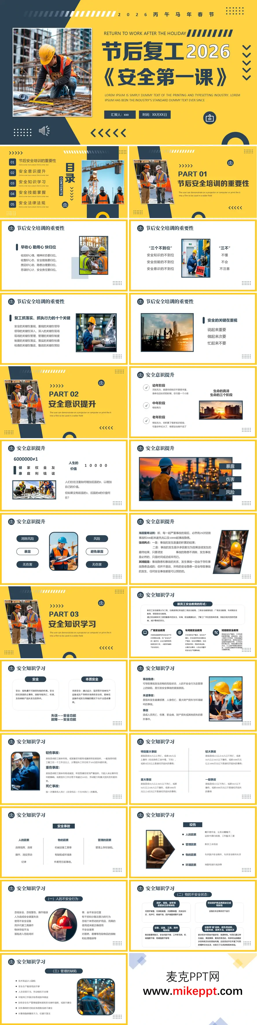 这套2026年节后复工安全培训PPT以“安全第一课”为主题,围绕春节后复工复产的安全管理需要,系统设计了五个核心部分,内容层层递进、结构清晰。 第一部分强调节后安全培训的紧迫性,指出员工可能存在的“三个不到位”——安全知识、技能和意识缺失,容易导致“不懂、不会、不注意”的“三不”现象。通过“复工抓落实十个关键”强调安全责任归位的重要性,并指出“安全的关键在重视”,避免“说起来重要,做起来次要,忙起来不要”的形式主义问题。 第二部分聚焦安全意识提升,通过人生三个阶段比喻,说明不同阶段对安全认知的变化,并借助“人生价值公式”强调安全是生命的基础(1),其他成就都是后面的0。同时引入海因里希法则,说明每起严重事故背后都有大量隐患积累,突出事故可预防性。 第三部分系统讲解安全基础知识,包括安全定义、事故分类(如特别重大、重大、较大和一般事故)、事故致因理论(人的不安全行为、物的不安全状态和管理的缺陷),并详细分析了十种不安全心理,如侥幸心理、麻痹心理、从众心理等,帮助识别潜在风险。 第四部分注重实用安全技能,涵盖火灾扑救方法(冷却、窒息、隔离、抑制四种灭火原理)、消防设备使用技巧(如灭火器、消火栓)、紧急逃生要点(低姿撤离、报警流程)和触电急救程序,强化员工应急处理能力。 最后一部分解读安全法律法规,明确从业人员享有的知情权、拒绝违章权、紧急避险权等六项权利,同时指出其必须履行的安全义务,并列举工伤认定情形,增强法律意识。 整套PPT内容理论与实践结合,通过概念阐述、案例分析和操作指引,全面构建了节后安全管理的知识体系,助力企业实现“早收心、勤用心、快归位”的复工目标。
