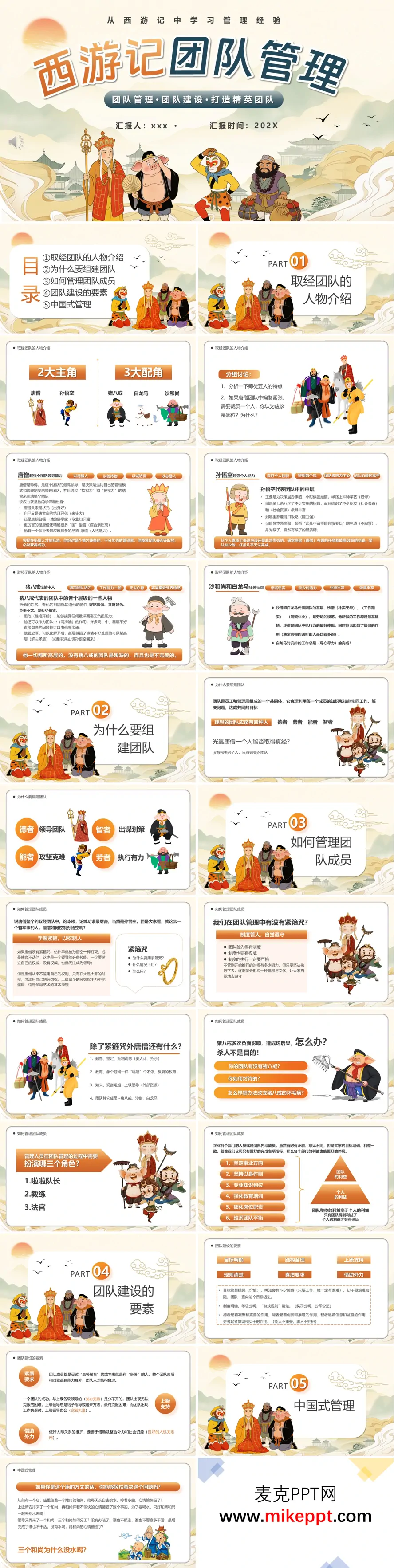 这份PPT以《西游记》取经团队为案例,生动阐述了团队建设与管理的核心要素。文档首先介绍了取经团队的成员构成,将唐僧、孙悟空、猪八戒、沙僧与白龙马分别对应为团队中的领导层、业务骨干、协调角色及执行基层,形象地展示了理想团队所需的不同人才类型及其职能互补性。 在团队管理策略方面,PPT重点分析了唐僧如何通过“紧箍咒”这一象征性的管理工具——即制度与权威,来约束能力突出但个性鲜明的孙悟空,强调制度管人、奖惩分明的重要性。同时,也指出领导者需以身作则,善用教育、外部资源与团队内部协作,形成合力。 团队建设部分提出目标明确、结构合理、规则清晰、上级支持等关键要素,并借助“三个和尚没水喝”的故事反面论证机制创新的必要性,提倡通过分工、考核与技术升级实现团队高效协作。最后,文档总结指出,中国式管理注重平衡人性与制度,在坚定目标的同时维系团队动态平衡,从而打造具有凝聚力和战斗力的精英团队。