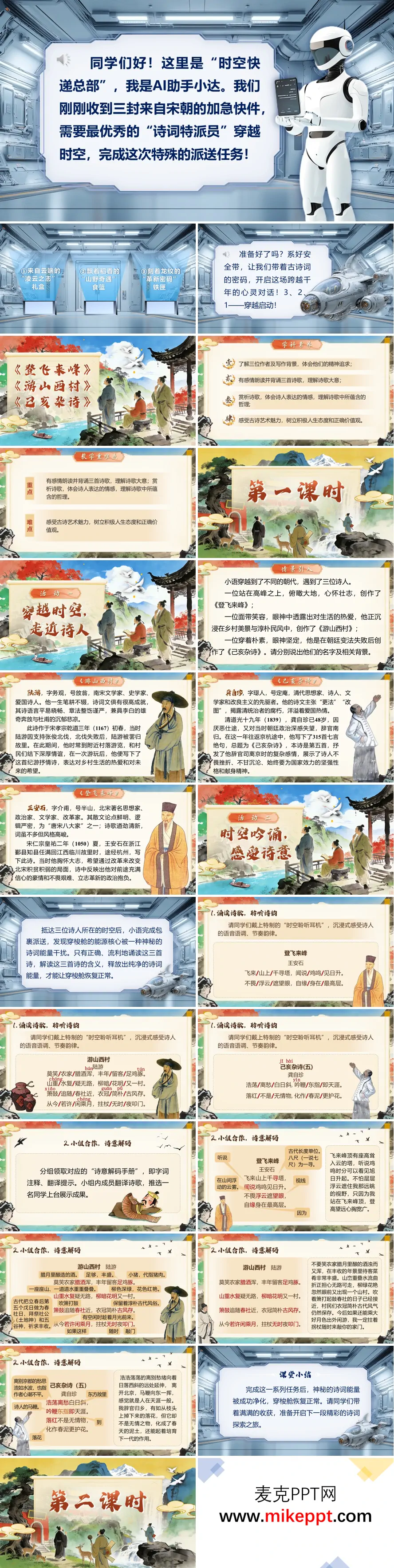 这是一套精心设计的部编版语文七年级下册古代诗歌专题PPT课件,共46张幻灯片,聚焦《登飞来峰》《游山西村》《己亥杂诗》三首经典作品。本课程旨在引领学生深入古典诗歌的瑰丽世界,通过系统学习达成多维度的教学目标:首先,夯实基础,识记王安石、陆游、龚自珍三位诗人的生平朝代及文学成就,精准掌握诗歌中的重点字词释义与用法;其次,深入文本,理解诗句字面含义,梳理诗歌的行文脉络,把握托物言志、借景抒情等艺术手法;最终,实现情感升华,领会"不畏浮云遮望眼"的豪迈胸襟、"山重水复疑无路"的哲思智慧、"化作春泥更护花"的奉献精神,真切感受古典诗词的文化魅力,培育对中华优秀传统文化的深厚情感与坚定自信。 课件设计匠心独运,分为四大板块有序推进:第一板块"穿越时空,走进诗人",通过生平轶事、创作背景等资料,构建诗人精神肖像,拉近学生与历史人物的心理距离;第二板块"时空吟诵,感受诗意",指导朗读技巧,在抑扬顿挫中体会平仄韵律之美,整体感知诗歌大意;第三板块"赏析诗句,读懂诗趣",采用炼字品句、意象分析、典故溯源等方法,细读深悟,体会诗人情志;第四板块"对比联读,突破困境",将三首诗置于同一时空坐标下,比较其思想内涵与艺术特色的异同,引导学生思考如何在人生困境中汲取精神力量,实现从知识理解到生命体悟的跨越。整套课件图文并茂,互动性强,既注重知识传授,更关注审美体验与人文精神的浸润。
