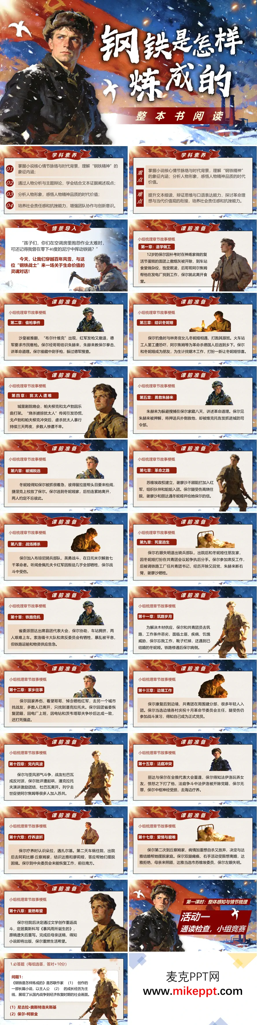 这是一套精心策划的语文七年级下册名著导读《钢铁是怎样炼成的》PPT课件,全篇共73张幻灯片,创新性地采用双课时立体化教学模式,旨在带领学生穿透时空壁垒,与奥斯特洛夫斯基笔下的英雄史诗展开深度对话。本课程立足于核心素养的全面发展:在文化理解维度,系统介绍作者革命生涯与创作历程,还原苏联早期建设时期波澜壮阔的社会图景;在思维训练维度,细致梳理保尔·柯察金从淘气顽童到钢铁战士的曲折成长线,剖析其性格从冲动到成熟、从自我到超我的升华轨迹;在价值塑造维度,着重诠释"钢铁精神"的当代内涵——那种在革命烈火与病痛苦难双重熔炉中淬炼出的坚韧不拔、为国忘私的崇高品格,激励学生树立"将小我融入大我"的人生信念,在逆境中磨砺意志,在奉献中实现价值。 教学架构彰显匠心,第一课时聚焦文本初识与框架建构。"通读检查·小组竞赛"环节打破传统提问模式,设计人物关系速配、情节线索抢答、金句填空挑战等积分任务,以游戏化机制激发阅读兴趣,在紧张刺激的团队竞争中夯实预习效果;"背景与情节梳理"模块则运用历史影像、数据图表、情节鱼骨图等多元媒介,引导学生理解"十月革命""新经济政策"等历史坐标对人物命运的影响,清晰把握筑路、伤病、写作等核心情节的生命隐喻。第二课时进阶为精神内省与实践迁移。"精神画像"部分通过关键词提炼、心理独白补白、成长曲线绘制等活动,立体解构保尔"四次跨越生死"的心路历程;"精神拍卖会"别出心裁地让学生用有限的"生命资本"竞拍"理想""信念""爱情""友谊"等价值项,在权衡取舍中深化对革命人生观的体悟;"主题辩论赛——'生命的意义'"紧扣原著核心命题,围绕"当代青年是否还需要保尔精神""物质丰裕时代如何定义生命的价值"等辩题展开思想交锋,在唇枪舌剑中廓清价值迷雾;终章"项目式学习——'钢铁精神传承计划'"则打通课堂内外,学生可选择采访身边的时代楷模、创作"新钢铁日记"、策划"青春与信仰"主题演讲等实践路径,将红色经典的阅读感悟转化为服务社会的实际行动,让"钢铁"不再只是书本上的符号,而是成为照亮前路的青春灯塔。整套课件以"读—思—辩—行"为脉络,让经典名著真正成为培根铸魂的精神富矿。