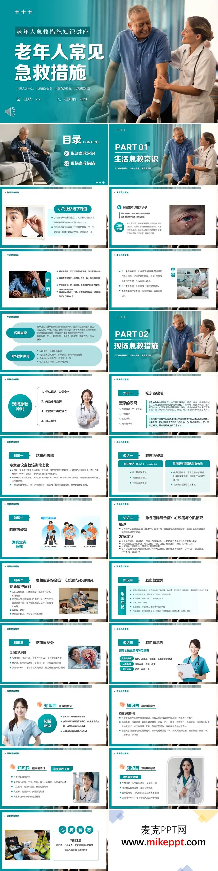 这套名为《老年人急救措施知识讲座》的PPT内容详实,结构清晰,主要分为“生活急救常识”和“现场急救措施”两大部分,系统介绍了老年人常见意外与疾病的识别与应对方法。 第一部分“生活急救常识”涵盖多种日常突发状况的处理。例如,当小飞虫钻入耳道时,切忌用手指乱掏,以免昆虫深入;眼睛进沙子不应揉搓,而应冷静让眼泪带出或请人协助检查;对轻度醉酒者可促其饮浓茶利尿,昏迷者需平卧并头侧一方防误吸;中暑者要迅速移至阴凉处,用冷敷降温并补充含盐饮料;昏厥者应立即平卧、保持气道通畅,必要时吸氧并呼叫急救。 第二部分“现场急救措施”重点讲解了三大危急病症:噎食、急性冠脉综合征和脑血管意外。针对噎食,PPT强调了海姆立克急救法的黄金抢救时间仅6分钟,并详细图示了自救与互救的腹部冲击法操作步骤。 对于心绞痛或心梗患者,需立即安静平卧、含服硝酸甘油;中风者应头部抬高、保持呼吸道通畅。此外,PPT还特别纳入徒手心肺复苏术的全流程,包括环境评估、意识判断、胸外按压(深度4-5厘米,频率100次/分)与人工呼吸(比例30:2)等关键步骤,并强调触电急救需先断电再施救。整体内容突出“时间就是生命”的急救理念,兼具知识性与操作性。