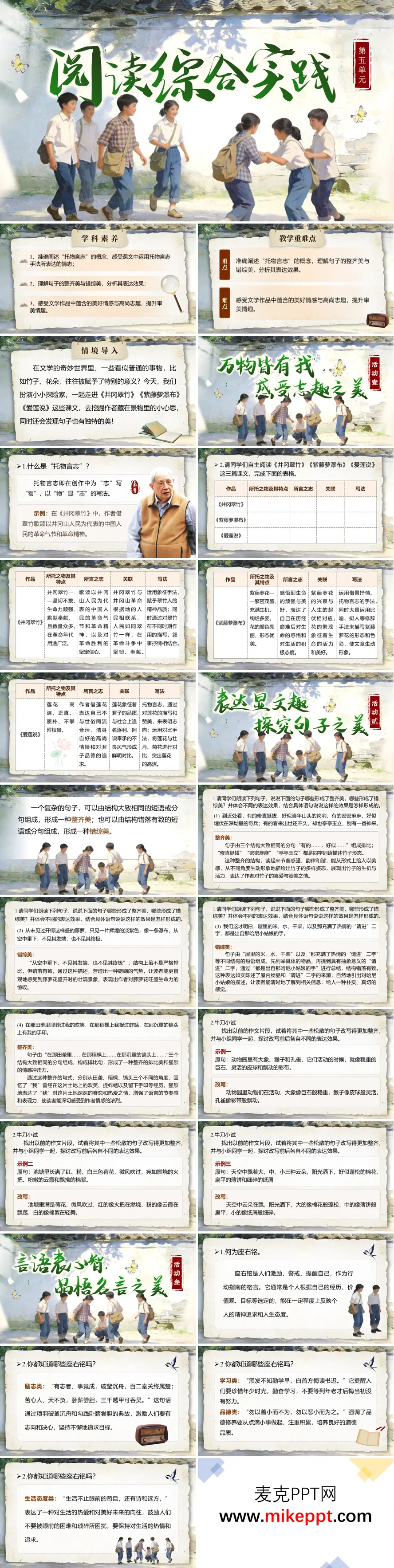 这是一套专为部编版语文七年级下册《阅读综合实践》匠心设计的PPT课件,共28张幻灯片,旨在引领学生登临单元学习的综合高地,实现从知识碎片到能力体系的跃升。课程以"梳理·巩固·提升·内化"为思维主线,首先系统梳理单元抒情课文的核心意脉,将《井冈翠竹》《紫藤萝瀑布》等名篇的情感密码逐一解码;继而深度巩固借景抒情、托物言志、象征手法等核心写作技巧,通过对比阅读、仿写训练等方式,让学生从"知其然"迈向"知其所以然";同时创设口语交际与书面表达的实践场域,引导学生在讨论争鸣与练笔创作中提升语文综合素养。更为深远的是,本课力求让学生沉浸于抒情诗文的文学魅力之中,在美的语言、美的意象、美的情怀中涵养审美情趣,并从单元诗文所承载的积极乐观、坚韧不拔的人生态度中汲取精神养分,树立健康向上的价值观。 教学设计紧扣语文核心素养,精心构建三大学习模块:首章"万物皆有'我',感受志趣之美",聚焦"托物言志"这一单元核心手法,通过"物"与"志"的对应关系图谱、三篇课文的互文式解读,让学生在自然意象与人生志向的关联中领悟"以物为镜,照见我心"的精妙;次章"表达显文趣,探究句子之美",引导学生驻足于点睛之笔,从词语锤炼、句式选择、修辞妙用等维度品味语言的匠心,在朗读涵泳中触摸句子的温度与力度;末章"言语表心志,品悟名言之美",则拓展至座右铭的文化探寻,让学生在"写一句箴言语,立一生成长志"的活动中,理解"座右铭"作为精神契约的意义,并尝试提炼个人成长格言,实现从文本阅读到生命践行的闭环。整套课件简约而不简单,以少胜多,助力学生在综合实践中实现语文能力的整合与精神的成长。