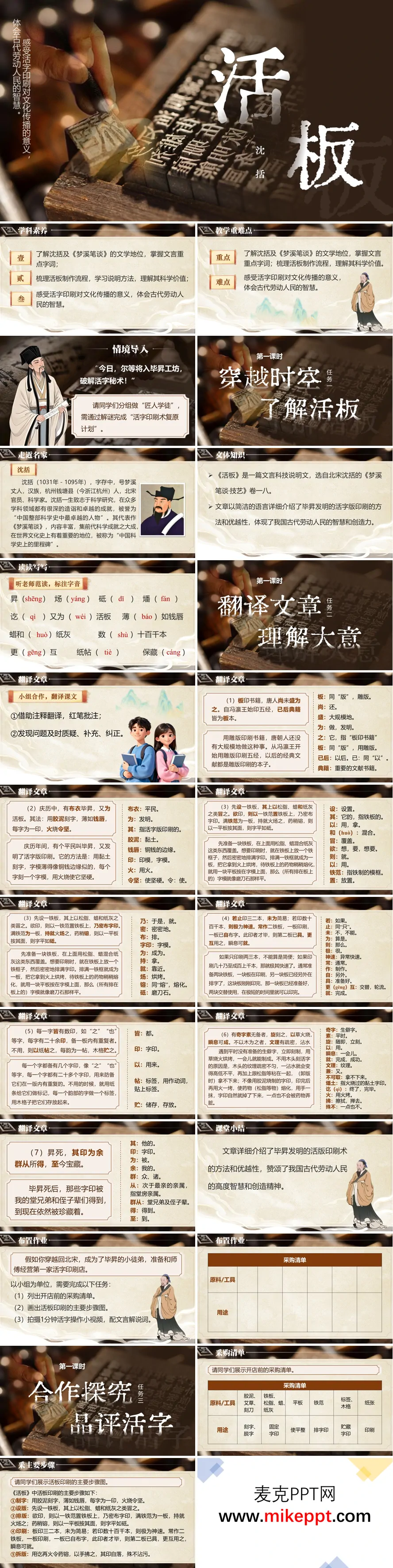 这是一套专为七年级下册语文第六单元《活板》精心设计的PPT课件,共计41张幻灯片,旨在带领学生深入探索北宋科学家沈括笔下的这一伟大发明。本节课的核心学习目标具有双重维度:在情感态度层面,着力引导学生深刻感受我国古代劳动人民卓越的智慧与非凡的创新精神,从而激发他们对中华优秀传统文化及古代科学技术的浓厚兴趣与热爱之情;在知识与能力层面,则着重帮助学生系统掌握课文中的重点文言字词含义及用法,并能够准确、流畅地翻译课文中的关键句子,切实提升文言文阅读理解能力。 这份演示文稿的内容架构科学合理,循序渐进地分为四个主要教学环节。第一环节为"穿越时空,了解活板",该部分首先向学生全面介绍《活板》的作者沈括——这位北宋时期杰出的科学家、政治家,以及他的学术成就与历史地位;其次详细讲解《活板》的文体知识,帮助学生理解这是一篇兼具科学性与文学性的说明文;最后梳理课文中的生字难词,为后续的文本学习扫清障碍,奠定坚实的语言基础。 第二环节"翻译大意,理解文意"强调学生的主动参与和合作学习。教师将引导学生以小组为单位,运用已学的文言文知识,结合课文注释与工具书,对《活板》全文进行逐句翻译与整体理解。通过小组讨论、互助答疑的方式,培养学生自主探究文言文的能力,同时加深对活字印刷术这一发明原理的初步认识。 第三环节"合作探究,品评活字"是本节课的实践体验与深度探究部分。首先,教师将指导学生根据课文内容列出制作活板的"采购清单",将抽象的文言描述转化为具体的物料需求;随后,通过展示精心设计的活板印刷主要步骤图,以可视化的方式呈现制字、排版、印刷、拆版等关键环节;最后播放活字操作小视频,让学生直观感受活字印刷术的精妙之处,实现从文本到实践的认知跨越。 第四环节"学习方法,感悟匠心"则上升到方法论与价值引领的高度。教师将引导学生总结学习《活板》所采用的文言文学习方法,如联系上下文推断词义、借助现代汉语知识理解古代科技词汇等;更重要的是,通过深入剖析沈括对活字印刷术的记载,引导学生体会古代工匠精益求精的工匠精神,感悟中华科技文明中蕴含的创新基因与人文价值,从而完成知识传授、能力培养与价值塑造的有机统一。