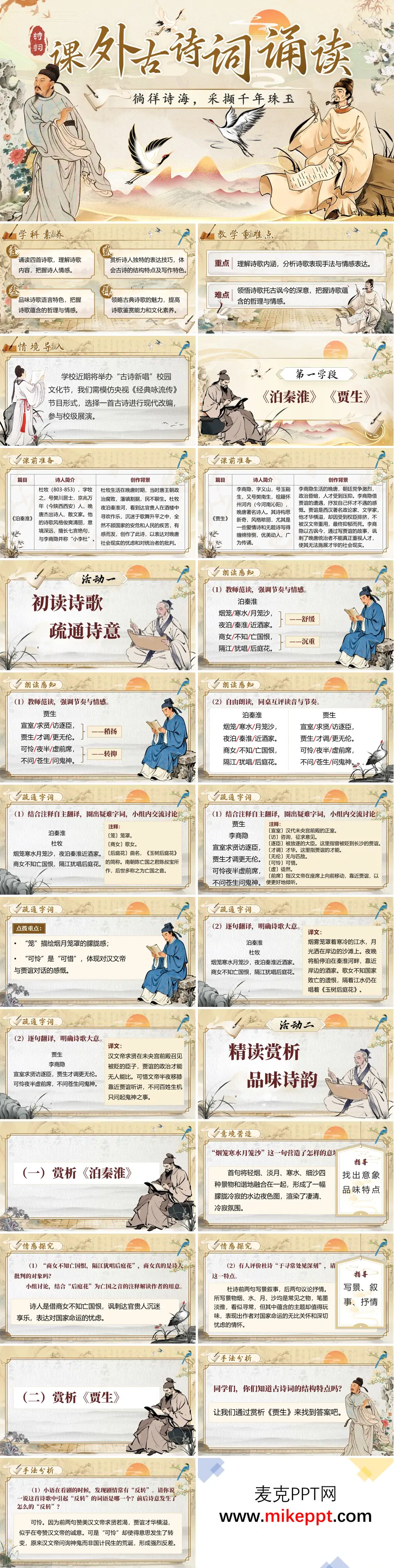 这是一套专为七年级下册语文第六单元《课外古诗词朗诵》精心打造的PPT课件,全册共计64张幻灯片,内容丰富详实,层次清晰分明。本节课的教学目标设定精准而全面,旨在通过系统化的教学设计,引导学生深入古典诗词的艺术殿堂:首先,着力培养学生有感情地朗诵诗歌的能力,使其在抑扬顿挫的诵读中逐步理解诗歌的深层内容;其次,引导学生准确把握诗人在作品中所寄托的思想感情,与古人展开跨越时空的心灵对话;再次,重点赏析诗人独特的表达技巧与艺术手法,帮助学生领会古诗精巧的结构特点与鲜明的写作特色,从而全面提升学生的古典文学素养与审美鉴赏能力。 这份演示文稿围绕《泊秦淮》与《贾生》两首经典诗作,科学合理地划分为五个循序渐进的教学板块。第一板块为"知人论世,走近诗境",该部分详细介绍两位诗人——杜牧与李商隐的生平经历、创作风格及其在晚唐诗坛的重要地位,同时深入剖析两首诗歌的具体创作背景,包括时代环境、历史事件与诗人个人际遇,为学生理解作品内涵提供必要的知识铺垫与语境支持。 第二板块"初读诗歌,疏通诗意"注重朗读实践与基础理解。教师将引导学生通过听范读、跟读等方式,初步把握诗歌的节奏韵律与情感基调;随后组织学生自由朗读,并鼓励与同桌相互点评,在互学互鉴中提升朗读水平;该板块还完整呈现两首诗歌的准确译文,帮助学生扫清语言障碍,建立对诗作内容的整体认知。 第三板块"精读赏析,品味诗韵"是本节课的核心环节。教师将引领学生逐字逐句细读文本,深入感受《泊秦淮》中朦胧凄清的秦淮夜色与深沉的家国忧思,体会《贾生》中辛辣的讽刺意味与怀才不遇的感慨;通过探究诗歌的意境营造、情感层次以及托物言志、借古讽今等写作手法,培养学生细读文本、品味语言的能力。 第四板块"对比探究,深化理解"强调比较阅读与深度思维。该部分引导学生对两首诗歌进行多维度对比:探究重点字词的精妙运用与多重意蕴,分析咏史诗这一题材的共性特征与个体差异,比较杜牧与李商隐不同的抒情方式与艺术风格,从而在对比中深化对作品的理解,提升批判性思维能力。 第五板块"情境拓展与课堂小结"则实现知识的迁移整合与升华。情境拓展环节通过创设相关历史情境或联系现实生活,激发学生的创造性思维,鼓励其学以致用;课堂小结部分系统梳理本节课的学习要点,巩固学习成果,并布置适当的课后延伸任务,使课堂教学与课外学习形成有机衔接,确保教学效果的持续性与延展性。整套课件设计体现了"诵读—理解—鉴赏—探究—拓展"的完整教学链条,充分彰显了古典诗词教学的独特魅力与教育价值。
