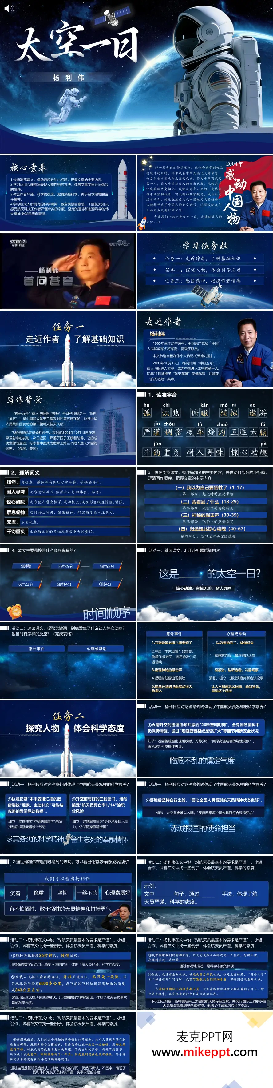 这是一套专为七年级下册语文第六单元《太空一日》精心制作的PPT课件,全套共36张幻灯片,内容紧凑充实,结构科学严谨。本节课的教学目标具有双重导向:在写作技能层面,着重引导学生深入学习文章中刻画人物性格的多种表现手法,包括细节描写、心理刻画、环境烘托等技巧,并鼓励学生将这些方法灵活迁移运用到自己的写作实践中,切实提升记叙文写作能力;在人文素养层面,则致力于引导学生深刻领会航天人所特有的科学精神,系统了解航天科技知识,真切感受我国航天科技工作者严谨求实、勇于探索、无私奉献的崇高品质,从而激发学生的民族自豪感与科学探索热情。 这份演示文稿围绕杨利伟的太空首飞经历,条理清晰地划分为三个层层递进的教学模块。第一模块为"走进作者,夯实基础",该板块首先向学生全面介绍本文作者杨利伟——中国进入太空的第一人,讲述他从飞行员到航天员的成长历程及其在中国航天史上的里程碑意义;其次详细交代文章的写作背景,包括"神舟五号"载人飞船发射的历史时刻、任务特点与社会影响;最后梳理课文中的生字难词与专业术语,如"共振""过载""舷窗"等,为学生深入阅读文本扫清知识障碍,奠定坚实的语言基础。 第二模块"探究人物,体会科学态度"是本节课的重点研读环节。教师将引导学生聚焦文本细节,深入思考杨利伟在太空飞行过程中遭遇各类意外情况时的应对表现:例如火箭上升阶段遭遇低频共振时的冷静处置、飞船进入轨道后面对未知现象的科学观察、返回途中舷窗出现裂纹时的沉着判断等。通过分析这些关键场景,引导学生总结归纳出中国航天员所具备的专业科学素养,包括过硬的心理素质、严谨的逻辑思维、精准的问题判断能力以及临危不乱的应变能力;同时从人物在危险时刻的言行举止中,提炼出杨利伟作为航天英雄所展现出的勇敢坚毅、沉着冷静、忠诚担当等优秀品质,实现文本细读与人物分析的深度融合。 第三模块"感悟精神,把握作者情感"则将教学视野从单篇文本拓展至宏阔的航天事业图景。该部分系统介绍中国航天事业的发展脉络:从"两弹一星"的艰难起步到载人航天的重大突破,完整呈现中国太空探索的历史进程;重点梳理中国航天事业的三大里程碑——1970年第一颗人造卫星"东方红一号"发射成功、2003年首次载人航天飞行圆满成功、2007年首颗探月卫星"嫦娥一号"成功发射;详细回顾中国载人航天工程"三步走"战略的实施历程与辉煌成就。通过这些内容的拓展延伸,帮助学生深刻理解《太空一日》背后所承载的国家记忆与民族情感,把握作者在平实叙述中蕴含的自豪之情与对航天事业的深厚热爱,从而实现知识传授、能力培养与价值引领的有机统一。整套课件设计体现了"由点及面、由文及人、由情及理"的教学逻辑,充分彰显了语文课程的育人功能与时代价值。