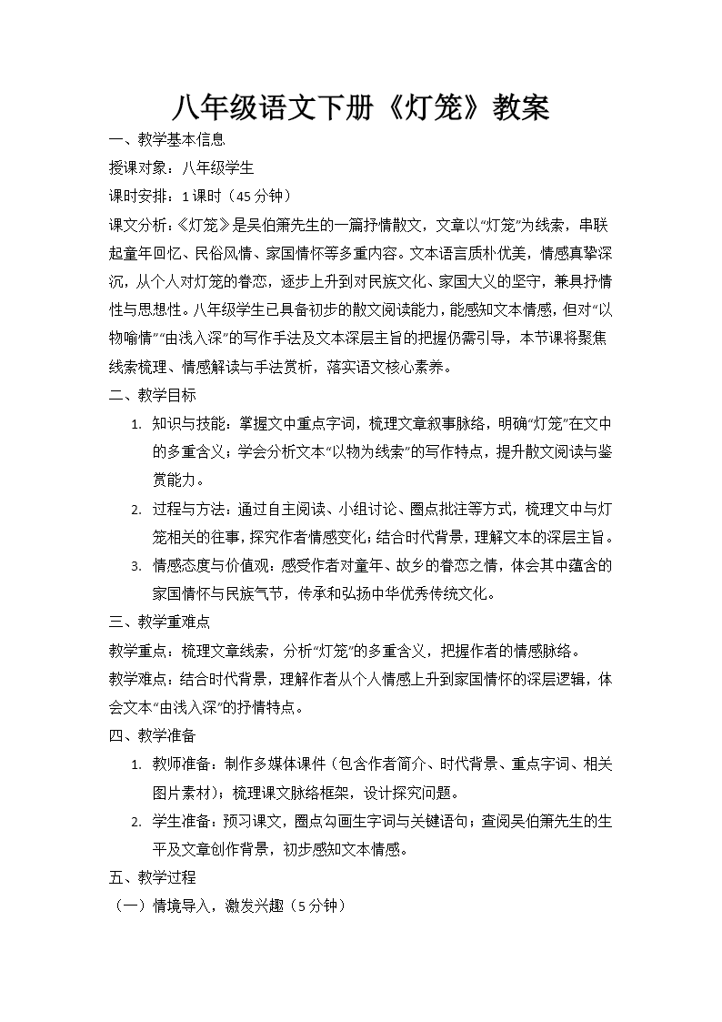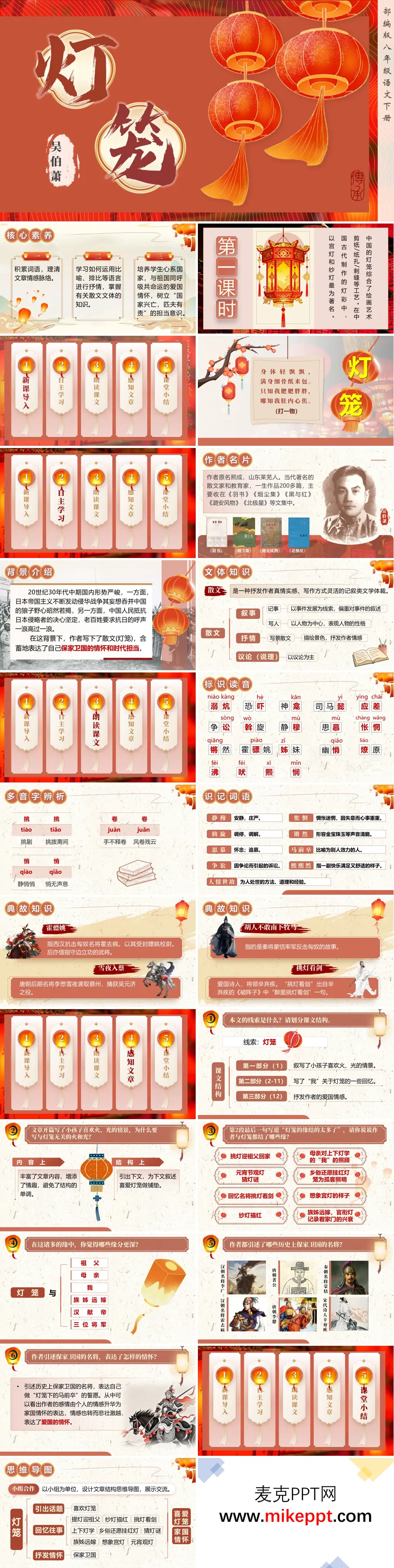这是一套专为部编版八年级语文下册散文《灯笼》量身定制的教学课件,整体采用红色暖色调设计,既契合"灯笼"这一传统意象的喜庆氛围,又暗合文章深沉的家国情怀,视觉风格与文本内涵相得益彰。课件围绕吴伯箫的经典散文展开了系统完整的教学设计,从作者背景到文体知识,从字词积累到文本细读,从结构梳理到主题升华,构建了一条清晰的教学脉络。 课件开篇以"知人论世"为起点,详细介绍了作者吴伯箫的生平经历与创作历程。吴伯箫作为现代著名散文家,其作品以质朴深沉、意蕴悠远著称。课件特别点明了文章的写作背景——20世纪30年代中华民族面临深重家国危机,作者于风雨如晦之际写下此文,借灯笼这一寻常物象寄托忧国忧民之情,使学生在进入文本前便能把握创作的时代动因与情感基调。同时,课件系统梳理了散文的文体知识,着重阐释"形散神聚"的艺术特征,帮助学生建立对散文体裁的整体认知,为后续的文本解读奠定理论基础。 在语言积累层面,课件设计了层次分明的字词教学板块。"识读字音"环节集中梳理课文中易错难读的字词,如"斡旋""怅惘""锵然"等;"多音辨析"环节聚焦"塞""省""调"等多音字在不同语境中的读音变化;"识记词语"环节则对"熙熙然""马前卒""人情世故"等重点词语进行释义与用法讲解。此外,课件还补充了"霍嫖姚"(汉代名将霍去病)、"胡人不敢南下牧马"(贾谊《过秦论》名句)等历史文化典故,引导学生深入理解文本背后的文化底蕴,体会作者将古典意象融入现代散文的创作匠心。 文本解读环节以"灯笼"为核心线索,精心梳理出"孩童爱灯—回忆灯笼—寄寓家国"的清晰行文结构。课件重点分析了作者与灯笼结下的多重缘分:既有祖父、母亲等亲人关爱所系的温情记忆,也有乡俗年节、喜庆仪式的民俗画卷,更有由灯笼引发的历史联想与英雄追慕。通过逐层深入的文本分析,课件引导学生体会作者如何由个人情感体验逐步升华为深沉的家国情怀,深刻理解散文"以小见大"的表现手法——以小小灯笼之"小",承载历史文化之"重"与民族情感之"大"。 为增强教学互动性与思维深度,课件特别设置了多元化的学习活动。"思维导图"环节引导学生自主梳理文章脉络,培养整体感知能力;"问题探究"环节设计了具有思辨性的讨论题目,如"作者为何由灯笼想到古代将领""结尾处'壮'字有何深意"等,激发学生深度思考;"拓展写作"环节则从品味关键语句出发,联系当代社会现实,鼓励学生探究灯笼在现代社会中的文化意义与精神价值。这些设计既完成了语文知识的传授与阅读能力的培养,也实现了爱国主义情怀的潜移默化与熏陶感染,充分体现了语文课程工具性与人文性的统一。