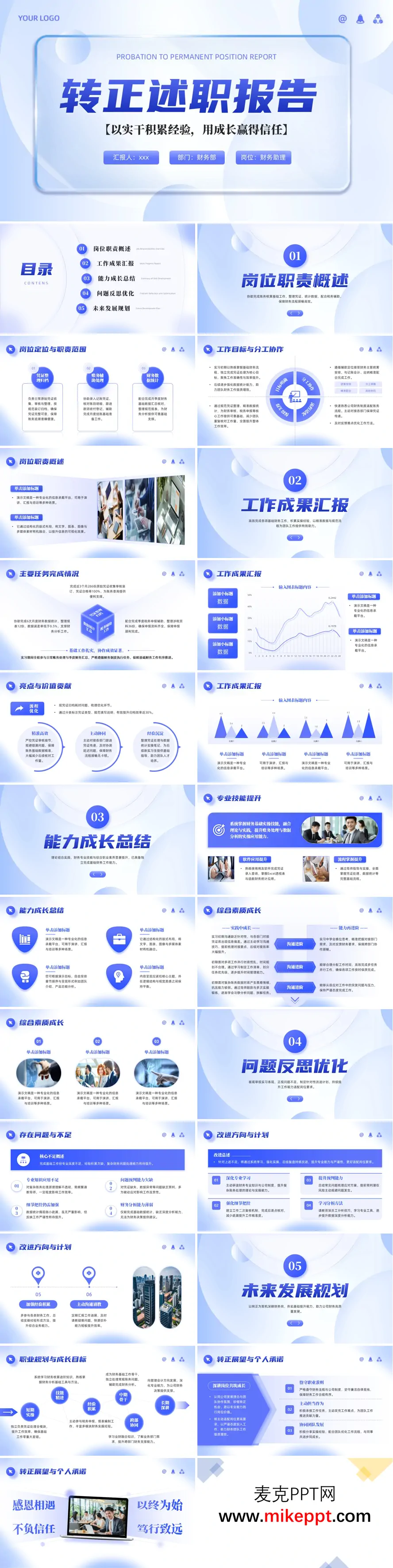 转正述职报告是每位职场人在试用期结束后,向组织和领导系统展示个人工作表现、能力成长与职业规划的重要载体。一份精心准备的述职报告,不仅是对过往阶段工作的梳理与反思,更是争取正式聘用、开启职业新篇章的关键环节。本演示文稿以25张幻灯片为框架,通过PowerPoint精心设计,全面构建了一个逻辑清晰、内容充实的述职汇报模板,旨在帮助述职者清晰、有力、有条理地呈现自己的试用期历程与未来潜力。 整个报告结构严谨,层层递进,共分为五个核心部分。第一部分“岗位职责概述”是汇报的基石。在此部分,述职者需明确阐述自身岗位在团队或公司中的定位与价值,清晰界定职责范围,并说明所承担的工作目标如何与团队整体目标协同,以及日常工作中的分工协作模式。这为后续所有成果与成长的陈述确立了坐标和语境。 第二部分“工作成果汇报”则进入实质性展示环节。这里需要以事实和数据为支撑,系统梳理在试用期内完成的主要工作任务、项目及其达成情况。更重要的是,要提炼出工作中的“亮点”与独特的“价值贡献”,例如通过某项创新优化了流程、解决了某个关键难题,或为团队带来了显著效益,从而证明自己不仅“做了事”,更“做成了事”、“做好了事”。 成果源于能力,第三部分“能力成长总结”便转向内在提升的剖析。此部分可划分为“专业技能提升”与“综合能力(或可迁移能力)总结”两方面。前者聚焦于岗位相关硬技能的精进,如软件操作、技术掌握、专业知识深化等;后者则关注沟通协作、问题解决、时间管理、学习适应等软实力的锻炼与收获,展现个人的全面发展潜力。 秉持着持续改进的态度,第四部分“问题优化反思”体现了述职者的成熟与坦诚。客观、理性地分析自己在工作中暴露出的不足或遇到的挑战,并基于此提出具体、可行的改进方向与行动计划。这部分展现了深刻的自我认知能力和主动寻求成长的决心,往往能赢得评审者的认可。 最后,第五部分“未来发展规划”将视野投向远方。它连接过去与未来,阐述转正后的职业规划、清晰的成长目标,以及如何将个人发展融入组织需要。同时,在此表达对于转正的积极展望和郑重的工作承诺,传递出渴望长期贡献、与公司共同成长的真诚意愿。 总之,本套PPT模板通过这五大板块的有机串联,为述职者提供了一个完整而专业的汇报蓝图。它不仅帮助系统化地总结过去,更引导思考未来,助力每一位试用期员工能够自信、全面、有说服力地完成述职,为顺利转正并开启下一段精彩的职业旅程奠定坚实基础。
