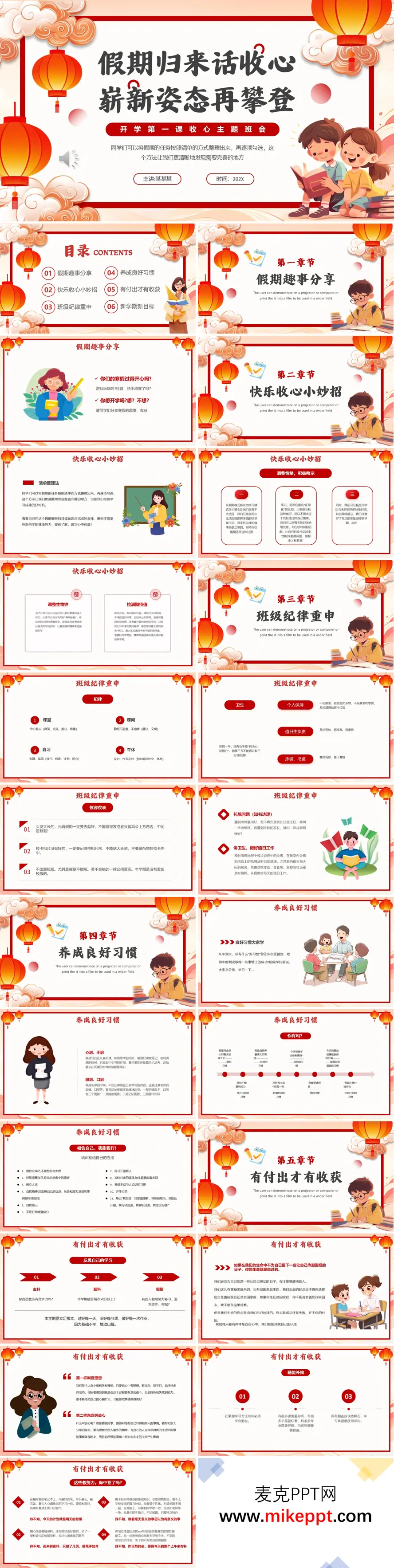 这是一套专为春季学期开学初设计的主题班会演示文稿,采用PowerPoint软件精心制作,共计34张幻灯片。其核心目的在于帮助学生顺利完成从轻松假期到规律校园生活的过渡,有效引导他们调整身心状态,以积极、专注的姿态迎接新学期的学习挑战。经历了一个寒假的休整,学生的生活节奏、作息习惯难免与在校期间的严谨有序有所不同。因此,通过一场以“收心”为主题的班会,系统性地进行引导和规划,对于学生迅速重建学习秩序、明确前进方向至关重要。 本演示文稿逻辑清晰、内容全面,从情感衔接、方法指导、规则巩固到目标设定,共分为六个循序渐进的环节,旨在全方位助力学生开启新学期。 第一部分:假期趣事分享。班会并非生硬地直接切入学习主题,而是以温暖的回忆作为起点。此环节鼓励学生分享寒假中的愉快经历与见闻,营造轻松、开放的交流氛围。这既是对假期生活的正式告别仪式,也能让学生在分享中感受彼此的快乐,拉近师生、生生之间的距离,为后续的收心教育做好情感铺垫。 第二部分:快乐收心小妙招。承接分享环节,自然过渡到状态调整的具体方法。此部分提供实用、可操作的策略,重点指导学生如何科学“调整生物钟”,逐步恢复与学校作息同步的规律生活。同时,通过积极的心理暗示,引导学生对新学期产生“新的期待”,激发内在的开学动力,将“要开学”的被动认知转化为“迎接新学期”的主动心态。 第三部分:班级纪律重申。良好的纪律是高效学习的基石。此部分带领学生重温班级规章制度和学校行为准则,重新明确课堂、课间、集体活动等各方面的要求。其目的在于强化学生的规则意识和集体观念,迅速重建有序的班级环境,为安心学习提供纪律保障。 第四部分:养成良好习惯。此环节深入探讨支撑长期学业成功的关键因素。它超越纪律层面,聚焦于更细致的学习习惯与生活习惯的培养,如预习复习、时间管理、物品整理等。通过引导学生认识到好习惯对学习效率的倍增效应,鼓励他们在新学期有意识地加以建立和巩固。 第五部分:有付出才有收获。这是引导学生进行深度自我反思与态度确立的核心部分。它促使学生审视过往的学习历程,明确“需要进步的地方”,从而端正学习态度。重点强调在学习过程中要“跟紧学习进度”,并勇于、善于“及时纠正自己在知识点上出现的错误和偏差”,将认知落实到具体的行动改进上,理解踏实耕耘与最终收获之间的必然联系。 第六部分:新学期新目标。在完成心态、纪律、习惯、态度的全面梳理后,班会最终指向未来。此部分引导学生结合自身实际,制定清晰、可行、有挑战性的新学期学习目标与个人成长计划。设定目标的行为本身,就是将收心的动力转化为持续行动的关键一步,为学生的新学期之旅提供明确的路线图。 总之,这套PPT模板结构完整、设计用心,紧密围绕“收心育人”的核心目标,通过环环相扣的六个部分,系统性地帮助学生实现从“假期模式”到“学习模式”的软着陆,为新学期的顺利启航奠定坚实的基础。