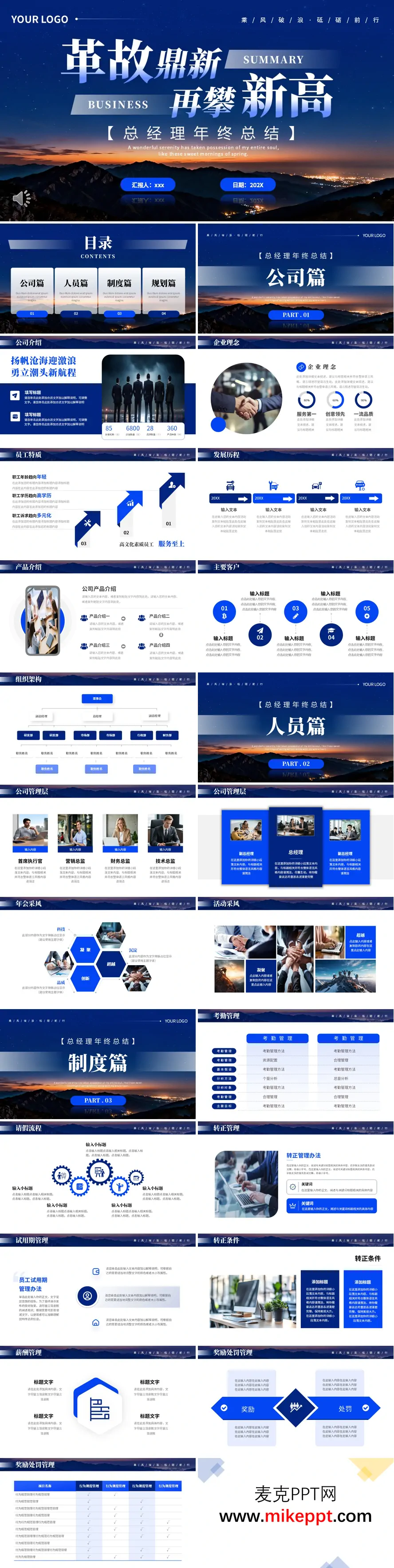 这是一套专为企业总经理或高层管理者设计,用于进行年度工作总结与汇报的演示文稿模板。它采用PowerPoint软件精心制作,共包含32张幻灯片,内容详实、结构清晰,旨在系统、全面地展现公司在过去一年的整体运营状况,并对未来发展做出战略性规划。年度总结不仅是对过往成绩的回顾与复盘,更是凝聚团队共识、明确未来方向、激发前进动力的关键管理活动。本套模板为总经理提供了专业的汇报框架。 演示文稿紧紧围绕企业管理与发展的核心维度,逻辑分明地划分为四个主要篇章,构成一个从宏观到微观、从现状到未来的完整汇报体系。 第一部分:公司篇。此部分立足于企业整体视角,进行全方位展示。内容涵盖公司介绍与企业理念,明确组织的身份标识与核心价值;通过阐述员工特质,呈现团队精神风貌;梳理发展历程,记录成长轨迹;详细介绍产品/服务,彰显核心竞争力;展示组织架构,明晰管理体系与权责分工;列举主要客户,印证市场认可与业务基础。该部分是整个总结的基石,定义了企业是谁、从何而来、为何而战。 第二部分:人员篇。企业的发展归根结底依靠人的力量。此部分聚焦于组织中最重要的资产——员工。它首先介绍公司的管理层人员,展现领导团队的风采与担当;其次,通过年会采风和活动采风等内容,生动呈现企业文化建设、团队凝聚力以及员工活力四射的精神面貌,让总结报告充满温度与人文关怀。 第三部分:制度篇。规范的制度是企业高效、稳定运行的保障。本部分系统阐述了公司内部的核心管理规章,包括考勤管理制度、请假流程、试用期管理、转正条件与转正管理,以及薪酬管理和奖励处罚管理等。这展示了企业在人才引进、日常规范、绩效激励与行为约束方面的制度化建设,体现了管理的规范性与科学性。 第四部分:规划篇。在总结过去的基础上,展望并规划未来是年终总结的落脚点。此部分首先引导进行自我评估,准确认清组织与个人(或团队)的优势与不足。进而强调树立正确的职业(或企业)价值观,以此为引领。目的在于增强职业(企业)竞争力,并最终指导大家做好切实可行的职业规划(或企业发展计划),为下一年度的目标设定与行动部署提供清晰的思路。 总而言之,这套《总经理年终总结》PPT模板,通过“公司-人员-制度-规划”四大篇章的有机串联,构建了一个既涵盖战略高度又深入管理细节的总结框架。它有助于总经理清晰、有条理地向董事会、全体员工或合作伙伴展示年度成果、阐释管理思想、传递企业文化并宣告未来蓝图,是企业年度管理工作中一项高效而专业的工具。