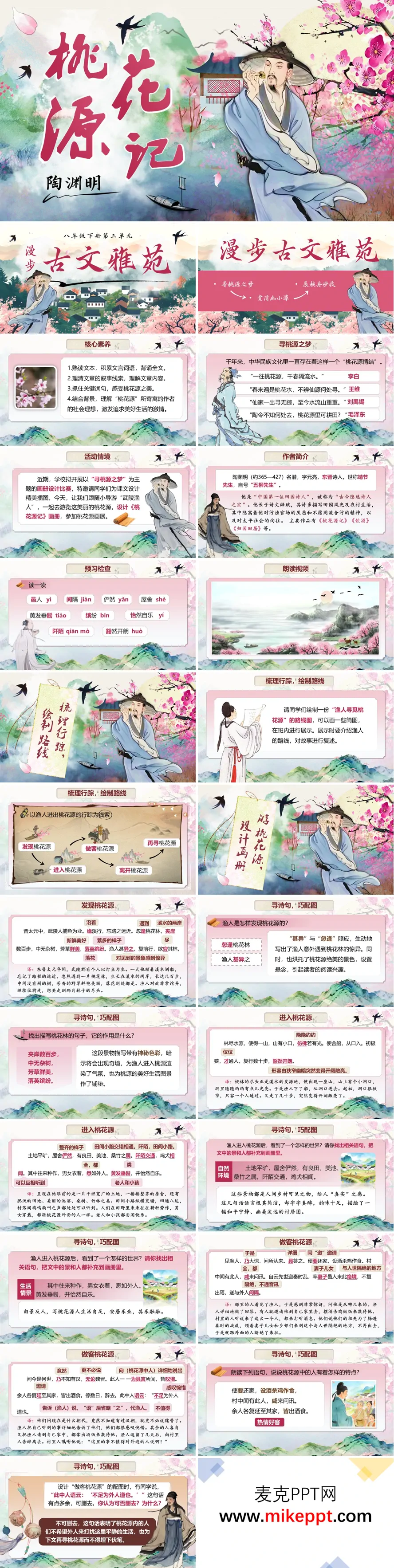 这套《桃花源记》PPT 课件,将灼灼其华的粉色桃花凝练为贯穿始末的视觉灵魂,在落英缤纷的唯美意境中,引领学子开启一场穿越千年的文本探索之旅。立足语文核心素养的培养目标,课程既注重文言字词的扎实积累,又着力于文章结构的深度梳理,更期待学习者能在字里行间触摸陶渊明笔下那片与世隔绝的理想净土。 全篇以渔人的探秘足迹为叙事脉络,循着"偶逢仙境—深入桃源—做客其间—惜别乐土—终难复觅"的完整情节链条铺陈展开。行至"芳草鲜美,落英缤纷"处,细品环境描写的铺垫之妙;读到"黄发垂髫,并怡然自乐"时,体悟乌托邦式的安宁画卷。 课堂中穿插"按图索骥绘行踪""对号入座配诗文"等趣味任务,辅以角色扮演的情境体验、拓展探究的深度思考及分层练习的能力巩固。在多维互动的沉浸体验中,学生将渐次领悟文本深层意蕴,感受作者对和平安宁、人人自足、平等祥和之理想社会的深情寄托与美好憧憬。