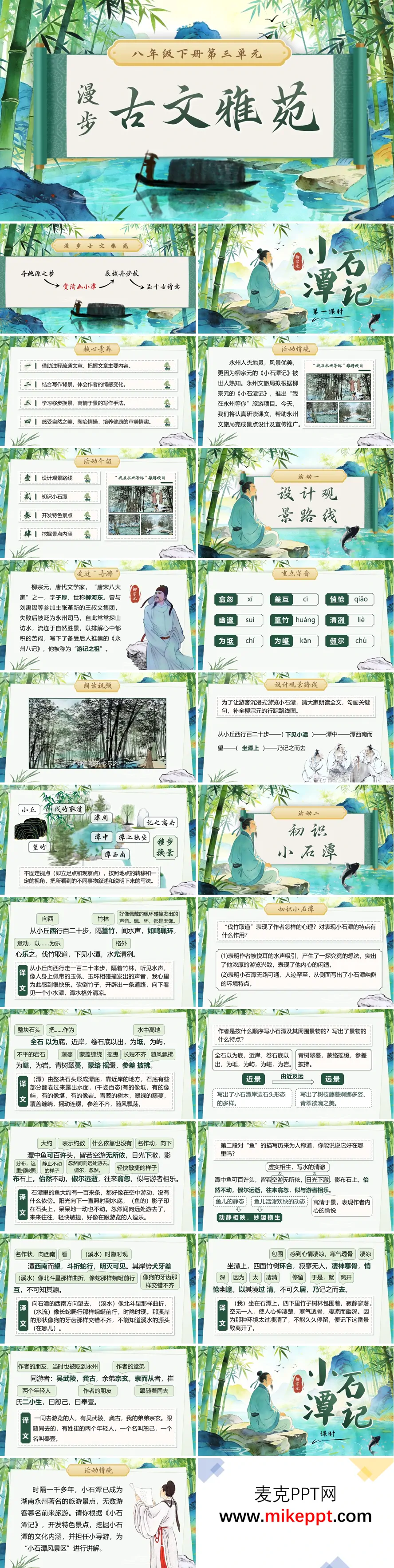 这套《小石潭记》PPT课件以清新雅致的水墨青绿为视觉底色,将柳宗元笔下那方幽邃清冷的潭水世界,化作一场身临其境的研学探秘。整堂课以"为永州文旅局策划小石潭景区开发方案"为驱动型任务,引领学生在真实情境中借助注释工具疏通文言脉络,品味作者移步换景的精妙笔法,以及字里行间潜藏的情感流转。 课程循着柳宗元的游踪层层展开,从"隔篁竹,闻水声"的听觉召唤,到"伐竹取道,下见小潭"的视觉惊喜;由"全石以为底"的潭体概览,渐入"潭中鱼可百许头"的生动特写,再及"斗折蛇行"的源流走势,终至"悄怆幽邃"的坐潭默感。每一个环节都紧扣文本细读,尤其聚焦"皆若空游无所依"等千古名句,让学生在水清鱼乐的动静对比中,领悟虚实相生的写景艺术。 课堂还设置了"规划最佳游览动线""设计网红打卡景点"等创意思考活动,引导学生在完成任务的过程中,自然关联柳宗元被贬永州的身世际遇。当学子们在绘制路线图时触摸到的那份"乐",与体悟到作者"凄神寒骨"背后的"忧"相互碰撞,便能深刻理解这篇山水游记表面清欢、内里孤愤的双重意蕴,最终读懂一代文豪借自然之美排遣胸中块垒的复杂心曲。