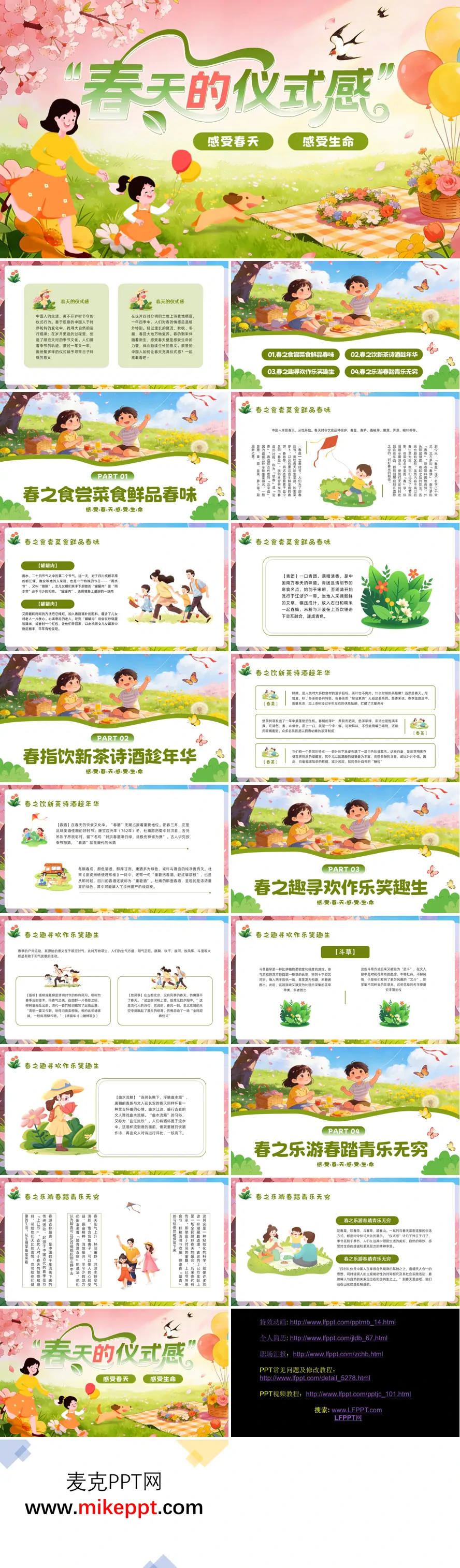 这套名为《春天来了,你好春天》的PPT演示文稿模板,以PowerPoint软件精心制作而成,共包含18张设计精美的幻灯片。春天,作为四季轮回中崭新的起点,象征着希望与复苏——当柔嫩的小草悄然破土,当大地重新披上绿装,万物都在此时焕发出蓬勃生机。这份生机不仅唤醒了大自然,也唤醒了我们内心对新年景的无限憧憬与期待。本演示文稿正是以“春天的仪式感”为核心线索,通过四个富有诗意的篇章,引领观者全方位、多感官地沉浸式体验春日独有的韵味与欢愉。 第一部分 “春之食:常菜食鲜,品春味” ,深入诠释了中国人“食为天”的哲学与顺应天时的生活智慧。对于国人而言,迎接春天最直接、最温暖的方式莫过于“吃春”。此部分不仅探讨了“享受春天,从吃开始”这一文化习俗,更具体展示了春季独有的时令蔬菜,如春笋、香椿、荠菜等,讲述如何通过舌尖上的鲜嫩,将转瞬即逝的春意转化为餐桌上的永恒美味,从而完成与季节的一次深度对话。 第二部分 “春之饮:新茶诗酒,趁年华” ,将焦点转向春天的饮品文化。这里着重介绍春天里最为矜贵的馈赠——春茶。叶片积聚一冬的精华,在春天绽放出极致的鲜爽,品茗一口,便仿佛饮下了整个山野的朝气。同时,该部分也阐述了春酒在传统饮食文化中的重要地位,无论是祭祀祈福还是亲朋欢聚,那一杯醇酿都承载着对丰饶年的祈愿与对当下美好年华的珍惜之情。 第三部分 “春之趣:寻欢作乐,笑趣生” ,则洋溢着动感与活力,详细介绍了丰富多彩的春季户外运动。告别冬日的蛰伏,人们纷纷走向户外,无论是放飞纸鸢、荡起秋千,还是进行一场酣畅淋漓的球类活动或徒步登山,都是在春风中舒展筋骨,在运动中收获健康与欢声笑语,充分体现了生命在春天里的躁动与喜悦。 第四部分 “春之乐:游春踏青,乐无穷” ,作为压轴篇章,升华了春天活动的集体性与审美意境。它描绘了呼朋引伴、举家出游,漫步于青山绿水间的经典场景。踏青不仅是简单的出游,更是一场与自然重逢的仪式,人们在赏花、观景、嬉戏的过程中,彻底融入春天的画卷,体验身心极大的放松与愉悦,感受人与自然和谐共生的无穷乐趣。 整份演示文稿结构清晰,内容从静态的饮食到动态的娱乐,从个人品味到集体欢庆,层层递进,完整勾勒出一幅生动而立体的春日生活风情画,不仅适用于主题展示,其本身的设计与内容也洋溢着浓厚的春天气息与人文情怀。
