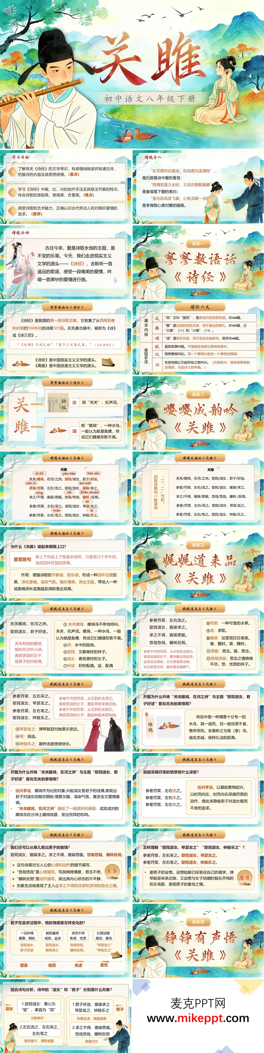 这套八年级下册《关雎》教学课件以典雅的国风插画为引,瞬间营造出先秦时代古朴而浪漫的诗意氛围。课程开篇即明晰学习目标,从《诗经》作为中国第一部诗歌总集的文学地位讲起,系统梳理"风、雅、颂"与"赋、比、兴"的"六义"内涵,为学生搭建起理解这部经典的思想框架。 课件主体精心设计了四个递进式互动环节:"寥寥数语话《诗经》"奠定文化基础;"嘤嘤成韵吟《关雎》"通过字音标注与反复诵读,让学生感受重章叠句、回环往复的音韵之美;"娓娓道来品《关雎》"逐句疏通文意,重点剖析"关关雎鸠,在河之洲"起兴手法的精妙运用;"铮铮有声悟《关雎》"则深入人物内心,细致呈现主人公从初见爱慕、辗转相思到求而不得的焦虑,再到幻想琴瑟友之的喜悦这一完整情感曲线。此外,课件还深入解读"淑女"的端庄贤淑与"君子"的德才兼备,引导学生从当代视角审视传统文化中的婚恋价值观,树立健康向上的情感态度。最后以针对性巩固练习收束全课,形成从知识习得、审美体验到价值引领的完整教学闭环。