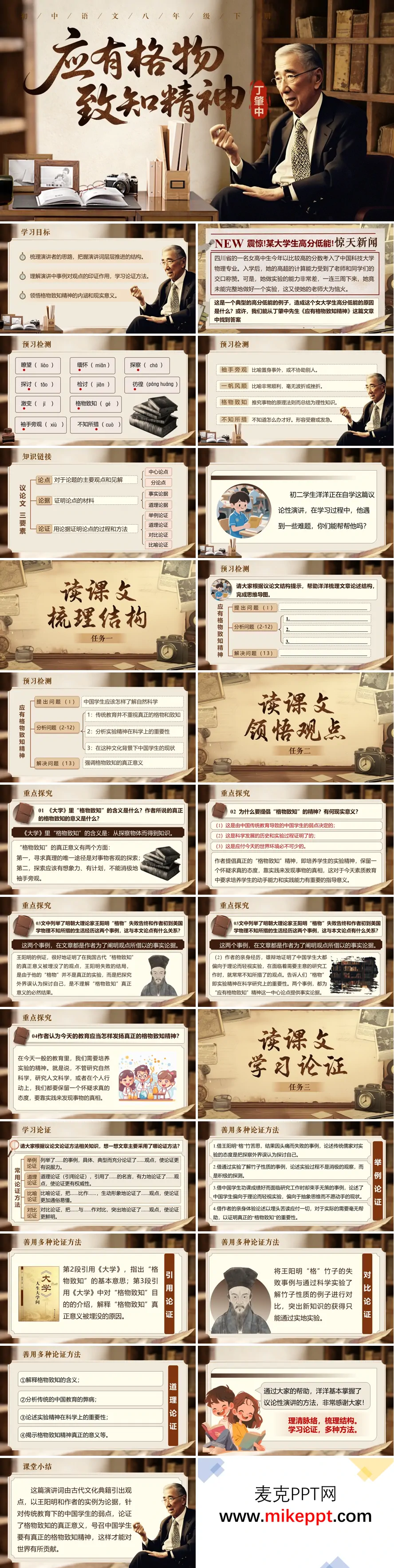 这是一套围绕诺贝尔物理学奖获得者丁肇中先生经典演讲《应有格物致知精神》精心设计的初中语文教学课件,整体风格复古沉稳,以旧书本与学者形象作为核心视觉元素,营造出浓厚的思辨氛围与学术气息,充分契合议论文教学理性、严谨的特点。 课件开篇以一则"某大学生高分低能"的社会新闻事件作为导入,这一贴近学生生活实际的现象迅速引发共鸣,激发学生对教育现状与学习方法问题的关注与思考;随后明确本节课的三维学习目标:在思维发展层面,引导学生梳理论证的思路与结构层次;在知识掌握层面,帮助学生理解议论文常用的论证方法及其作用;在价值引领层面,促使学生深刻领悟"格物致知精神"的内涵及其对当代学习生活的现实意义。这种从现实问题出发、以目标为导向的设计,体现了语文教学联系生活、学以致用的课程理念。 主体教学内容从预习检测环节切入,首先通过系统的字词积累,梳理"缅怀""探察""探讨""彷徨""袖手旁观""不知所措"等重点词语的音形义,夯实语言基础;同时链接议论文三要素(论点、论据、论证)的文体知识,为学生搭建理解演讲稿这一特殊议论文体的认知框架,明确本课的学习路径与思维工具。 核心教学环节精心设计了三大递进式任务模块,层层深入地展开文本研读。"读课文,梳理结构"模块引导学生整体感知全文,把握"提出问题—分析问题—解决问题"的经典议论文行文逻辑:开篇由中国传统教育弊端引入话题,中间分析"格物致知"的真正含义与现实缺失,结尾发出培养实验精神的呼吁,形成完整而严密的论证闭环。"读课文,领悟观点"模块带领学生深入辨析核心概念,对比《大学》中"格物致知"的传统释义(推究事物原理以获得知识)与丁肇中先生所强调的现代"实验精神"(通过科学实验主动探知、追求真理)的本质差异,理解作者对传统文化批判继承的立场,以及针对中国基础教育重理论轻实践之弊的深刻反思。"读课文,学习论证"模块重点探究文本的论证艺术,详细分析王阳明"格竹"失败的传统案例与作者自身在美国留学经历的个人案例,理解举例论证的具体作用;梳理文中对《大学》等经典的引用,体会引用论证增强权威性与文化底蕴的效果;关注传统教育与现代科学教育、中国学生与西方学生的对比,把握对比论证突出强调的功能。 课件还系统解析了举例论证、引用论证、对比论证等常用论证方法的定义、特点与表达效果,结合具体文本语句进行细致分析,使学生在实例中掌握议论文的写作技巧。课堂小结部分归纳本课的核心知识点与思想收获,作业布置则延伸课堂学习,或让学生搜集身边的"格物致知"实例,或撰写短文谈谈实验精神对培养实践能力的重要性,实现从理解到运用的能力迁移。 整套课件从基础积累到深度探究,从知识传授到价值引领,形成了完整的教学闭环。学生在掌握议论文阅读方法的同时,深刻领悟到"格物致知"精神对于纠正应试教育弊端、培养创新实践能力、提升科学素养的重要现实意义,充分体现了语文学科在思维发展与精神成长方面的独特育人功能。