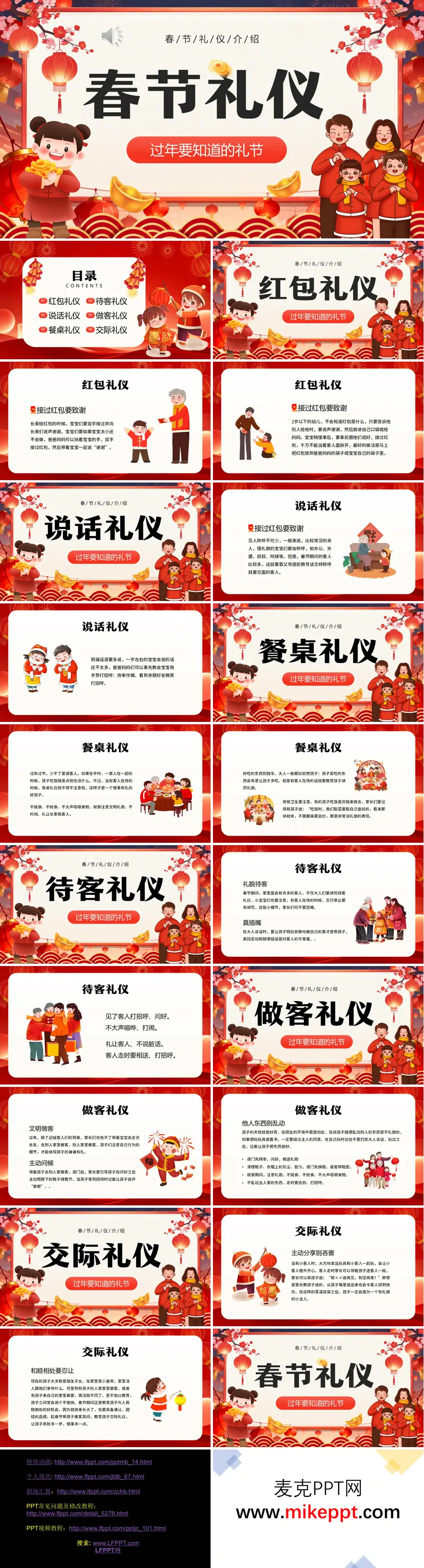 这套PPT以"春节礼仪——过年要知道的礼节"为主题,专为儿童节庆礼仪教育而设计。全套内容分为六大板块:红包礼仪教导孩子双手接红包并致谢,不应当面拆开;说话礼仪强调正确称呼长辈、学说吉祥话与抱拳作揖;餐桌礼仪要求孩子不挑食抢食、礼让长辈、注意用餐卫生;待客礼仪规范家中来客时的言行举止,做到不插嘴、主动问好、礼貌送客;做客礼仪则提醒孩子进门拜年、换鞋整洁、不乱动他人物品;交际礼仪着重培养孩子主动分享玩具、与小伙伴和睦相处的谦让品格。整套PPT图文并茂,寓教于乐,是家长春节期间对孩子进行传统文化教育的实用指南。