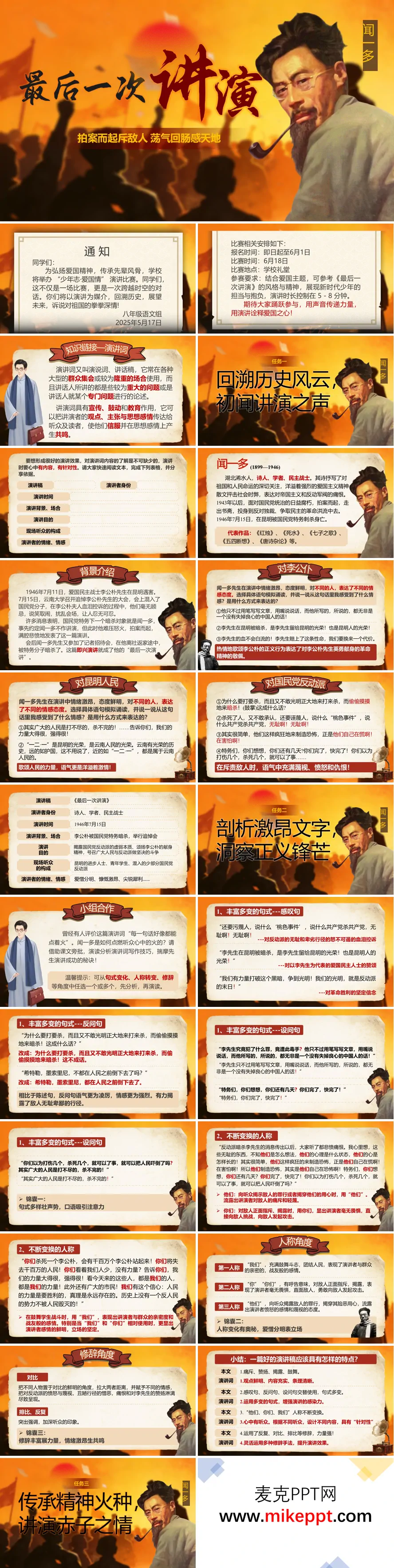 这是一套围绕闻一多先生经典演讲《最后一次讲演》精心设计的语文教学课件,整体风格以炽热的橙红色为主色调,搭配历史人物画像与复古质感的背景设计,视觉上极具冲击力与历史厚重感,完美贴合这篇演讲慷慨激昂、义愤填膺的情感基调,为学生营造出身临其境的历史氛围。 课件开篇以学校"少年比爱国情"演讲比赛的活动通知作为情境导入,这一设计巧妙建立历史与现实的联系,让学生意识到演讲不仅是历史的回响,更是当下可以亲身实践的语言艺术;随后明确本节课的核心教学目标——以演讲为媒介回溯峥嵘历史,在文本品读中传承爱国精神,激发学生的使命感与参与热情。这种任务驱动式的导入,既揭示了学习意义,又调动了学习积极性。 主体教学内容精心划分为三大任务模块,层层递进地展开深度研读。第一模块"回溯历史风云,初闻讲演之声"着重构建历史语境,系统介绍演讲者闻一多先生的生平事迹与崇高人格——作为诗人、学者、民主战士,他的一生是追求真理、献身民主的一生;详细交代1946年李公朴先生遇刺这一震惊中外的历史事件,以及闻一多在李公朴追悼会上即席发表此演讲的危急背景,让学生深刻理解这"最后一次讲演"所承载的生死抉择与民族大义,为理解文本的激烈情感奠定历史认知基础。 第二模块"剖析激昂文字,洞察正义锋芒"深入文本内核,进行细致的语言艺术分析。课件引导学生关注演讲稿多变的句式特点——大量感叹句("李先生在昆明被暗杀,是李先生留给昆明的光荣!")直抒胸臆,强化情感爆发;多重反问句("这成什么话?""这能算是理由吗?")增强质问气势,引发听众思考;排比句式("你们杀死一个李公朴,会有千百万个李公朴站起来!")形成排山倒海的语势。同时重点分析人称的巧妙转换:"你"直指敌人,怒斥其卑劣行径,短兵相接,针锋相对;"我们"团结群众,凝聚正义力量,同仇敌忾;"他们"指代烈士,表达崇敬缅怀,激励后人。这种人称策略的运用,使演讲爱憎分明、极具情感冲击力与现场感染力。 第三模块"传承精神火种,讲演赤子之情"设计了一系列沉浸式实践活动。通过为历史影像配音、模拟闻一多演讲姿态与语气、小组合作进行演讲片段展演等方式,让学生在实践中内化文本情感,体验演讲艺术的魅力,真切感受闻一多先生至死不渝的英雄气概与视死如归的民主精神,实现从文本理解到情感共鸣再到价值认同的升华。 此外,课件还包含小组合作探究环节(讨论演讲的成功要素与历史影响)、修辞手法专项解析(系统梳理对比、反复、呼告等手法)、课堂小结与拓展延伸等板块。这些设计既扎实落实了演讲稿的文体知识、修辞技巧等语文要素,又让学生在品读语言、模拟实践中深刻传承爱国精神,培养正义感与使命感。整套课件知识性与感染力并重,历史性与现实性兼具,是一份充分体现语文学科立德树人功能的优质教学资料。