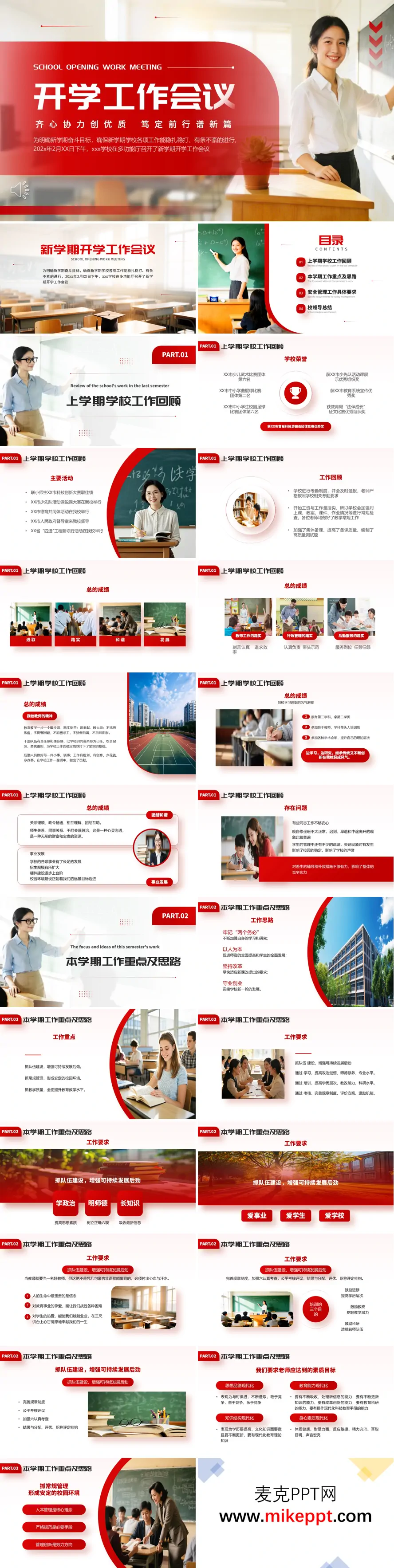 这套PPT以“开学工作会议”为主题,整体设计风格简洁明了,采用蓝白配色,显得正式而清晰。内容结构分为四个主要部分:上学期工作回顾、本学期工作重点及思路、安全管理工作具体要求以及校领导总结。 PPT开篇明确了会议目标,即明确新学期奋斗目标,确保各项工作稳扎稳打、有条不紊。第一部分回顾了上学期学校在荣誉获奖、主要活动、教学管理等方面的成绩,总结了“进取、踏实、和谐、发展”的总体风貌,同时也指出了工作中存在的不足,如部分教职工工作不安心、学生管理存在疏漏等。第二部分重点阐述了本学期的工作思路,强调以人为本、坚持改革,并围绕队伍建设、常规管理和教学质量提升提出了具体要求和措施,包括加强教师培训、完善考核制度、创新课堂教学模式等。第三部分聚焦安全管理,从安全防范、隐患排查、宣传教育、常规管理及疫情防控等方面提出了细致要求,确保校园安全无死角。最后,校领导总结部分号召全体教职工以高标准、高质量落实各项工作,坚守安全底线,共同谱写学校发展新篇章。