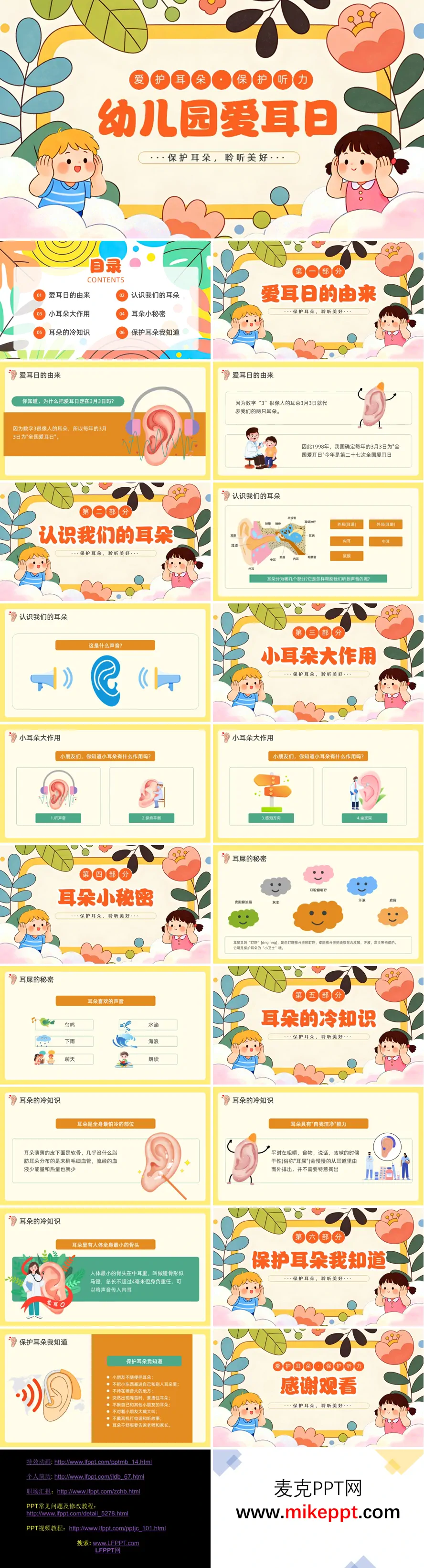 这是一套专为幼儿园精心设计的"爱耳日·保护耳朵"主题班会PPT课件,整套课件共包含21张精美幻灯片,内容层层递进、图文并茂,旨在通过生动有趣的方式帮助幼儿建立科学的用耳意识,养成保护听力的好习惯。整个主题活动围绕六大核心板块展开,构成完整的知识体系。 第一板块聚焦"爱耳日的由来",通过故事化讲解和日历展示,让孩子们了解全国爱耳日的设立背景、具体日期及其重要意义,在幼小心灵中播下关注听力健康的种子。第二板块"认识我们的耳朵"采用高清解剖示意图和卡通插画相结合的方式,带领孩子们开启一场耳朵探索之旅,直观认识耳廓、耳道、鼓膜等结构,并通过动画演示声音传播的奥秘,解答"我们是如何听到声音的"这一科学问题。 第三板块"小耳朵大作用"通过互动游戏和生活场景模拟,引导孩子们发现耳朵在语言学习、平衡维持、危险预警等方面的多重功能,深刻体会耳朵的重要性,从而自发产生爱护耳朵的情感共鸣。第四板块"耳朵的小秘密"以趣味问答形式揭示耳朵鲜为人知的特性,激发幼儿的探究兴趣。 第五板块"耳朵的冷知识"更是别出心裁,向孩子们介绍耳朵是人体最怕冷的部位、具有神奇的自洁功能、内含人体最小的骨头——镫骨等奇妙知识,并延伸讲解冬季保暖、正确清洁等实用护耳技巧。最后的第六板块"保护耳朵我知道"整合前面所学,通过儿歌、口诀和情境判断题,教会孩子们远离噪音、不挖耳垢、防水入耳等具体保护方法,将知识转化为日常行为习惯,真正实现"教育一个孩子,影响一个家庭"的健康教育目标。整套课件逻辑清晰、寓教于乐,是开展幼儿健康教育的优质教学资源。