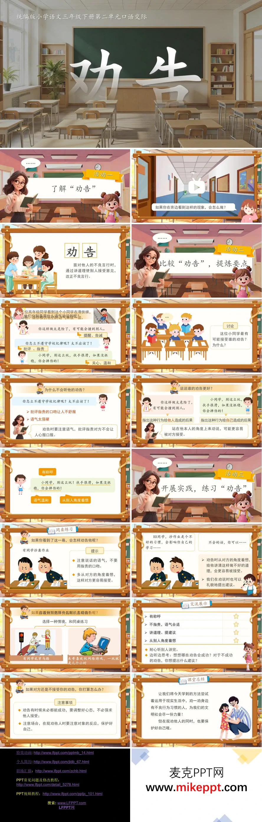 这是一套专为统编版小学语文三年级下册第二单元精心设计的口语交际课件,以"劝告"为核心主题,旨在系统培养学生温和、得体、有效的沟通方式与口语交际能力,体现了语文课程重视实践应用、关注生活实际的课程理念。 课件开篇以熟悉的教室场景作为切入点,营造真实的交际情境,自然引入本课学习主题。活动一"了解'劝告'"首先从概念层面入手,明确界定"劝告"的内涵——当面对他人的不良言行或不当做法时,通过摆事实、讲道理的方式,使对方能够虚心接受意见、主动改正错误行为。这一环节帮助学生建立对交际任务的清晰认知,区分"劝告"与"批评""命令"等易混淆概念,为后续学习奠定概念基础。 活动二"比较'劝告',提炼要点"是教学的核心环节。课件精心设计了"同学滑扶梯"这一贴近学生校园生活的典型情境,并展示了三种截然不同的劝告方式:第一种是简单直接的提醒告诫式("别滑了,危险!"),第二种是带有情绪的批评指责式("你怎么这么不听话,太不像话了!"),第三种是充满关怀的温和劝导式("同学,你好!这样滑扶梯很容易摔倒受伤,我们扶着扶手慢慢走,好吗?")。通过引导学生对比分析三种方式的效果差异,小组讨论、归纳总结,最终提炼出有效劝告的四大核心要点:一要有恰当的称呼,体现尊重与礼貌;二要语气温和,避免生硬或指责;三要从对方角度着想,表达关心而非说教;四要明确指出不当行为可能导致的后果,增强说服力。这种通过案例比较自主建构知识的方式,符合小学生的认知特点,使交际技巧的掌握更加牢固。 活动三"开展实践,练习'劝告'"为学生提供了充分的操练机会。课件精心设置了"同学抄作业""行人乱穿马路""同伴沉迷网络游戏"等多个贴近学生日常生活、具有现实教育意义的交际场景,难度由易到难,层层递进。学生通过同桌合作练习、小组交流展示等形式,将刚刚习得的劝告技巧运用于实际交际,教师适时点拨评价,强化正确做法,纠正不当之处。同时,课件还特别提醒学生:劝告是一种沟通艺术,若对方一时未能接受,要学会调整心态,尊重他人选择,注意自我保护,避免冲突升级,体现了对学生交际安全与人际交往智慧的培养。 课堂总结部分,教师引导学生回顾本课所学的劝告方法与注意事项,鼓励学生将课堂所学积极运用到家庭、学校、社区的真实生活中,在文明劝告、善意提醒中传递互助友爱的价值观,既提升了个人的口语交际能力,也促进了和谐人际关系的构建。整套课件从概念认知到技巧提炼,从模拟练习到生活运用,形成了"知—学—练—用"的完整教学链条,充分体现了口语交际教学的情境性、实践性与互动性特点。
