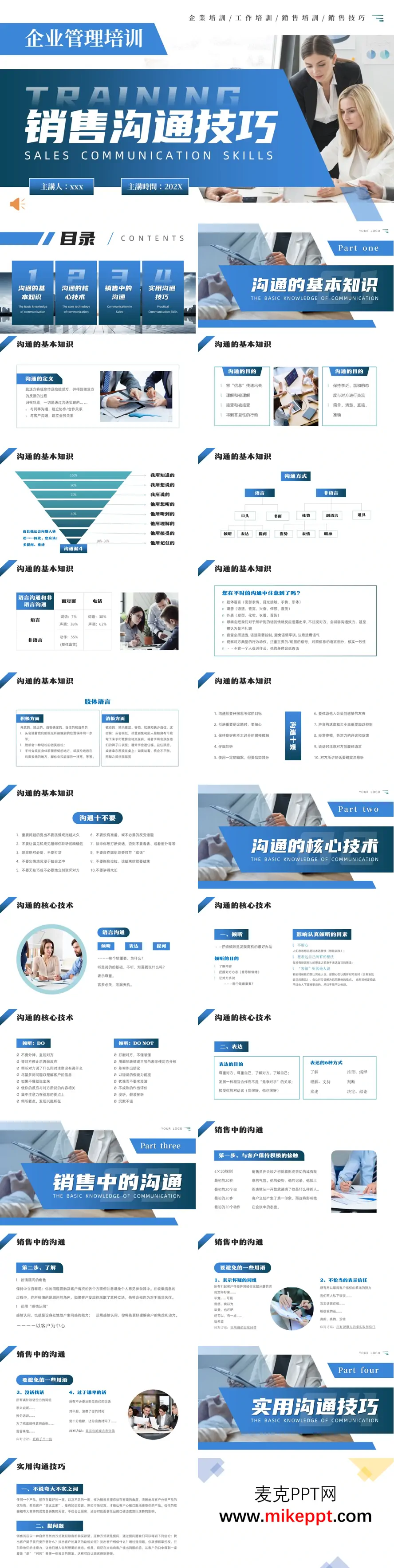 这是一套面向企业销售人员的《销售沟通技巧》培训PPT,共分为四大模块: 第一部分介绍沟通基础知识,涵盖沟通的定义与目的,重点展示"沟通漏斗"模型——信息从"我所知道的"到"他所记住的"会衰减至10%-30%,强调多提问、重述的重要性;同时解析语言与非语言沟通(肢体语言占比55%)的运用,并列出"沟通十要"与"十不要"的行为准则。 第二部分聚焦沟通核心技术,强调倾听是发现商机的关键(需做到"三分话七分言"),以及表达时建立合作关系、避免对立的重要性。 第三部分进入销售实战场景,提出"4×20规则"(前20秒、20词、20步、20动作定基调),指导如何以顾问身份客观收集信息,并列举四类禁用语:表示怀疑的词组、过度谦卑、填补空白的废话及不恰当地表示信任。 第四部分总结八大实用技巧:客观介绍产品、巧用提问引导、适时真诚赞美、避免负面词汇、替换专业术语、换位思考、不与顾客争执、多听少说。整套PPT强调以客户为中心,通过有效沟通建立信任,最终实现销售目标。