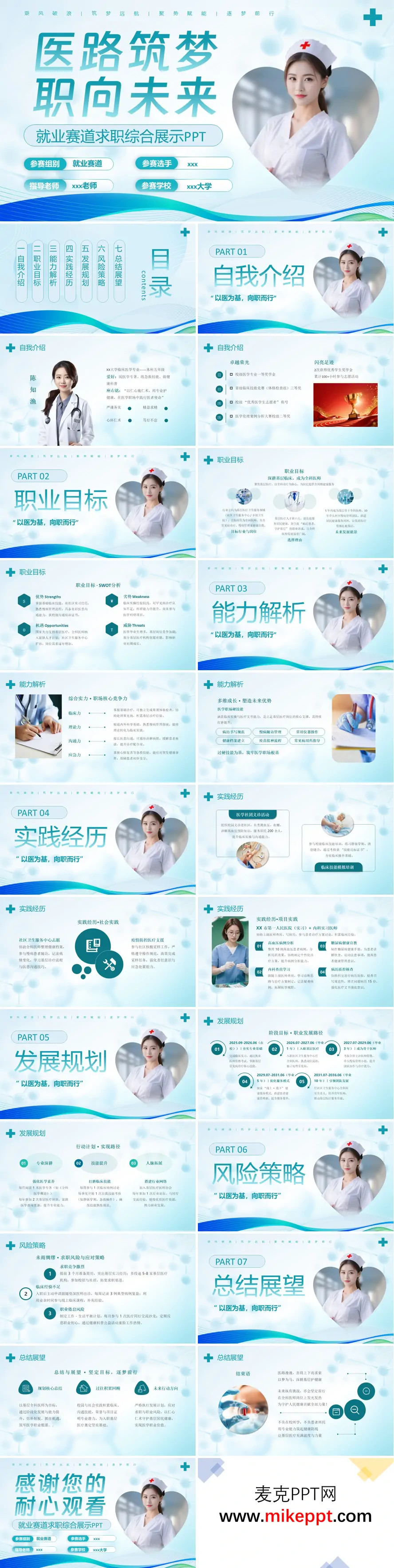 这是一份题为《医路筑梦职向未来》的医学生就业赛道求职展示PPT,参赛者陈知渔来自XX大学临床医学专业本科五年级。 PPT系统呈现了从医学生到基层全科医师的完整职业规划蓝图。开篇通过"严谨务实、精益求精、心怀仁术、笃行不怠"四个关键词展现个人特质,并展示了校级医学专业一等奖学金、省级临床技能竞赛三等奖等荣誉。 核心内容分为七大板块:职业目标明确深耕基层、成为全科医师的志向,通过SWOT分析论证可行性;能力解析从临床力、理论力、沟通力、应急力四个维度展示核心竞争力;实践经历涵盖医学社团义诊、社区卫生服务中心志愿服务、疫情防控支援及市第一人民医院实习等,累计服务200余人次;发展规划制定了从2025年至2036年的五阶段成长路径,从夯实专业基础到最终成为科室负责人;风险策略针对求职竞争、经验不足等提出应对方案。 整套PPT以"乘风破浪、筑梦远航"为主线,体现了"以仁心施仁术,用专业护健康"的职业追求,展现了医学生扎根基层、守护居民健康的坚定信念与清晰路径。