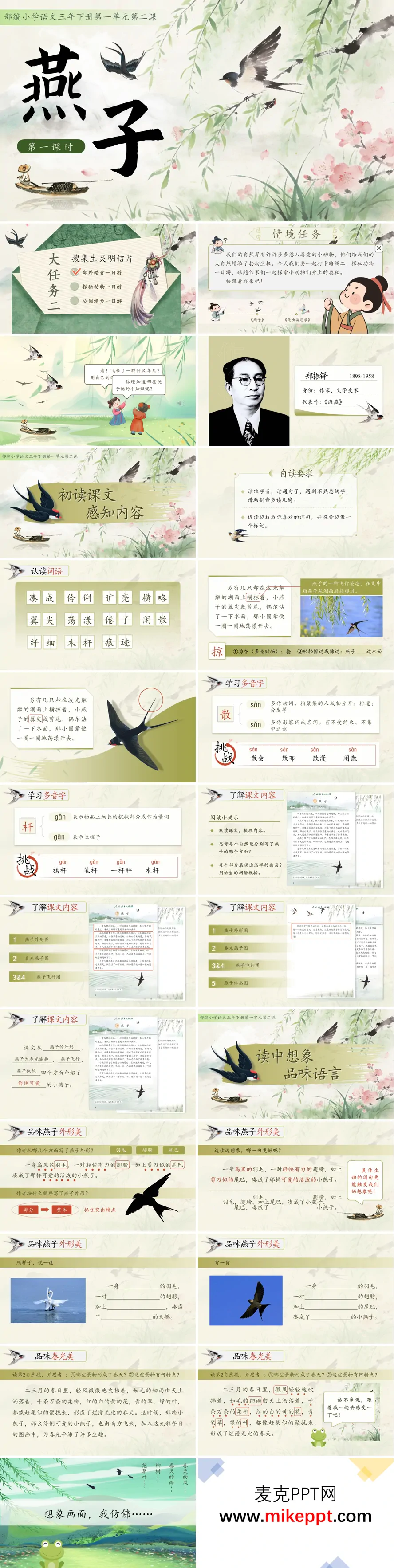 本套教学课件专为统编版小学语文三年级下册《燕子》一课量身打造,整体采用清新明丽的花鸟插画作为视觉底色,满溢着盎然春意与生命活力。全课紧扣"自然生灵"这一核心主题,精心创设"搜集生灵明信片"的沉浸式情境任务,引领学生跟随课文一同探寻燕子的灵动奥秘,在情境驱动中激发探究兴趣。 课件开篇以作者简介切入,简要呈现郑振铎先生的文学成就与创作背景,为文本解读奠定人文基调。初读环节聚焦语言基础,通过"凑成""伶俐"等富有表现力的词语认读,以及"散""杆"等多音字的辨析积累,帮助学生扫清阅读障碍,并顺势梳理出"燕子外形—春光燕子—燕子飞行—燕子休憩"的清晰文脉结构。 精读品读部分是课件的核心所在,从乌黑发亮的羽毛勾勒出的活泼可爱形态,到烂漫春光映衬下的诗意栖居场景,再到斜飞横掠时轻盈灵动的飞行姿态,层层深入地引导学生紧扣关键词句展开丰富想象,在脑海中勾勒栩栩如生的画面,细细体味作者遣词造句的精妙传神。配合精心设计的仿写训练,让学生将阅读感悟转化为个性化表达。 此外,课件还系统整合了识字书写指导、词语积累拓展、课后迁移练习等板块,将语言基础知识的学习、文学文本的深度阅读与创意表达能力的培养有机融合,既扎实筑牢学生的语文根基,又引领他们在字里行间深切感受春日生命的灵动韵律与文学之美。