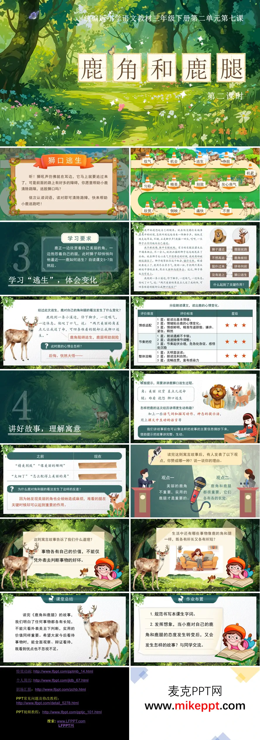 这是一套专为《鹿角和鹿腿》第二课时精心设计的教学课件,承接第一课时的学习内容,将教学重心聚焦于"狮口逃生"这一关键情节,引导学生在紧张生动的故事发展中,细致体会鹿的心理变化轨迹,进而深入理解寓言所蕴含的深刻道理。 课件开篇设计了一个富有童趣的互动游戏——"帮助小鹿清除路障、逃脱狮口",巧妙地将词语复习融入情境任务。学生需要正确认读"匀称""精美""抱怨""挣脱"等第一课时学过的重点词语,才能帮助小鹿扫清逃生道路上的障碍。这种游戏化的巩固方式,既检验了学生的字词掌握情况,又自然过渡到本节课的核心情节,激发了学生的学习兴趣与参与热情。 "学习'逃生',体会变化"是本节课的重点研读板块。课件引导学生聚焦课文第5至7自然段,逐层梳理鹿遭遇狮子、拼命奔逃、脱险反思的完整过程。通过圈画关键词句、标注心理描写,学生清晰发现情节的戏剧性转折:原本被鹿百般嫌弃、认为"太细了,配不上美丽的角"的四条细腿,在生死关头却爆发出惊人的力量,"撒开长腿就跑""把狮子远远地甩在了后面",成为救命的关键;而它曾经引以为傲、精心欣赏的美丽鹿角,却在逃命过程中被树枝挂住,"差点儿送了我的命"。这一鲜明的对比,让学生直观感受到鹿的心理转变——从最初"欣赏角、抱怨腿"的片面审美,到"感叹腿救命、角惹祸"的深刻反思,为理解寓意提供了情感基础与认知铺垫。 "讲好故事,理解寓意"环节将教学推向思维深化层面。课件首先借助对比表格,系统梳理鹿角与鹿腿在外观、功能、鹿的态度、实际作用等方面的差异,使"各有长短"的认识可视化;随后组织"观点辩论"活动,让学生分别站在"鹿角更重要"与"鹿腿更重要"的立场展开讨论,在观点碰撞中认识到两者缺一不可、各有价值;最后通过"生活联想"环节,引导学生联系身边事例,如"漂亮的文具不实用""朴实的朋友很可靠"等,将寓言道理迁移到现实生活。经过层层引导,学生最终自主提炼出核心寓意:事物各有其价值与功能,不能仅凭外表的美丑来判断好坏,应当全面、辩证地看待问题。 课堂总结部分,教师引导学生回顾鹿的心理变化曲线与寓言道理的发现过程,强化"认识转变"与"辩证思维"两个关键词;作业设计则安排了"续写故事"的创造性任务——想象脱险后的鹿再次遇到同伴,会如何讲述自己的经历与感悟。这一设计既巩固了本课所学,又给予学生个性化表达的空间,进一步深化对"全面、辩证看待事物"这一核心寓意的理解与内化。整套课件从游戏巩固到情节梳理,从心理体会到寓意提炼,从口头表达到书面创作,形成了完整的学习闭环,充分体现了寓言教学"读故事—悟道理—用生活"的学科逻辑。
