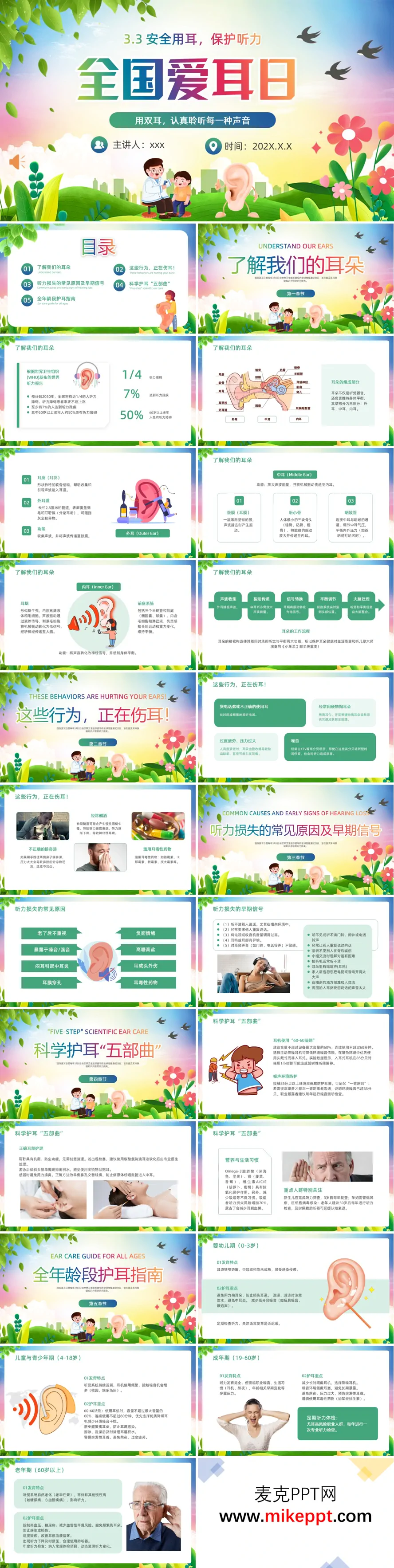 这是一份以"3月3日全国爱耳日"为主题的健康教育PPT,旨在普及耳科保健知识、预防听力损失。 PPT内容分为五大板块:首先通过世界卫生组织数据揭示全球听力健康现状(预计到2050年近1/4人口将有听力障碍),并详细解析耳朵的生理结构——包括外耳(集音)、中耳(传音放大)和内耳(感音与平衡)三部分,阐述声波从收集到大脑处理的完整工作流程。 其次指出常见伤耳行为,如长时间煲电话粥、用硬物掏耳、接触高分贝噪音、酗酒、滥用耳毒性药物等,并列举听力损失的早期信号(如听不清对话、耳鸣、调高音量等)。 重点提出"科学护耳五部曲":遵循耳机使用"60-60法则"(音量不超60%、时长不超60分钟)、噪音环境佩戴防护耳塞、正确清洁护理(避免频繁掏耳)、补充Omega-3等营养素,以及对新生儿、孕妇、老年人等重点人群的特别关注。 最后针对不同年龄段(0-3岁婴幼儿、4-18岁青少年、19-60岁成年人、60岁以上老年人)给出差异化护耳建议,强调定期检查、远离噪音、慎用药物和及时就医的重要性。整份PPT图文并茂,兼具科学性与实用性。