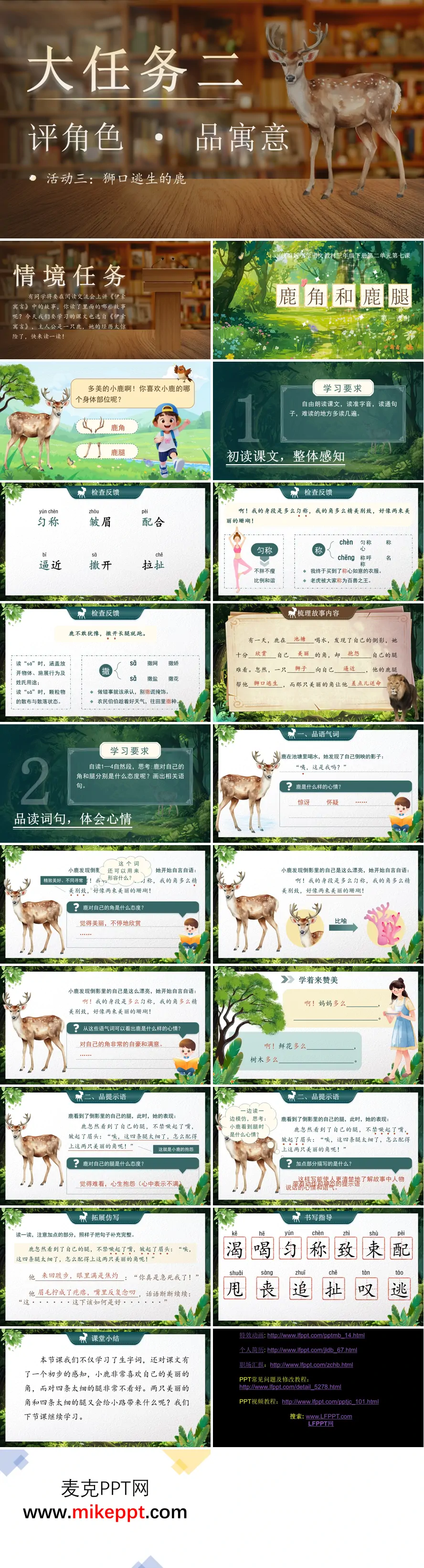 这是一套专为《鹿角和鹿腿》第一课时精心设计的教学课件,属于"大任务二·评角色·品寓意"单元系列活动的重要组成部分,以"狮口逃生的鹿"为贯穿始终的情境任务展开教学。课件整体设计理念贴合三年级学生的认知发展特点,遵循从字词积累到文本感知、从内容梳理到情感体会的渐进规律,为学生搭建起理解寓言故事的坚实阶梯。 课件导入环节别出心裁,以"你喜欢小鹿的哪个身体部位?"这一贴近儿童生活经验的提问开启课堂。学生可以结合自身审美偏好自由发言,有的欣赏鹿角的精美别致,有的关注鹿腿的矫健有力,在轻松愉快的交流氛围中自然引入课文主人公,激发阅读期待与探究兴趣。 "初读课文,整体感知"环节注重阅读习惯的培养与基础知识的落实。课件引导学生运用默读与朗读相结合的方式,自由读通课文,标画自然段序号,初步感知故事大意。在字词学习方面,重点指导"匀称""皱眉""抱怨""珊瑚"等生字词的正确读音与语境用法,通过"词语开花""找朋友"等游戏巩固识记效果。同时,借助填空练习帮助学生梳理故事脉络:一只漂亮的鹿来到池塘边喝水,它首先欣赏自己美丽的角,却抱怨细长的腿,直到遭遇狮子追捕才经历了一场惊险的逃生。这种结构化概括既训练了学生的信息提取能力,又为第二课时深入分析"逃生"情节埋下伏笔。 "品读词句,体会心情"是本节课的核心研读板块。课件引导学生聚焦文中描写鹿自言自语的关键语句,如"啊!我的身段多么匀称,我的角多么精美别致,好像两束美丽的珊瑚!"通过圈画感叹词、分析比喻修辞、揣摩语气语调,体会鹿对自己角的自豪与喜爱之情;再对比品读"唉,这四条腿太细了,怎么配得上这两只美丽的角呢!"抓住"唉""太细了""怎么配得上"等关键词,感受鹿对腿的不满与抱怨。此外,课件还精心设计了仿写练习,让学生模仿"多么……多么……""怎么……呢"等课文句式,表达人物的自豪或抱怨情绪,在语言实践中加深对文本的理解,提升表达能力。 课堂小结部分具有承前启后的功能。一方面系统回顾本节课所学的生字新词与主要内容,通过"词语闯关"游戏强化记忆;另一方面梳理初读收获,点明鹿对自己身体部位的态度存在明显偏见,并巧妙设置悬念:当狮子突然出现时,美丽的角和细长的腿究竟谁能救鹿一命?引导学生对下节课探究鹿角与鹿腿的实际作用充满期待,形成持续的学习动力。整套课件从趣味导入到字词夯实,从内容梳理到情感品味,从文本理解到语言运用,循序渐进地推进学习进程,充分体现了第一课时"读通、读顺、读薄"的教学功能定位。