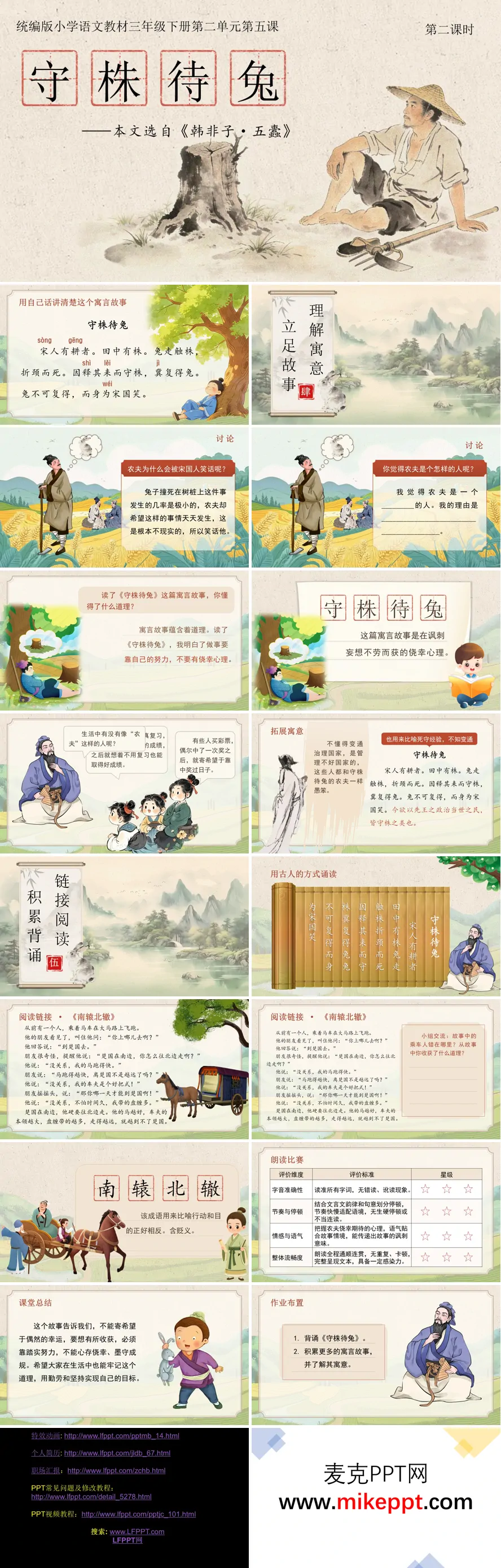 这是一套专为《守株待兔》第二课时精心设计的教学课件,承接第一课时的文意疏通与字词积累,将教学重心转向寓言深层寓意的理解与现实意义的挖掘,引导学生在思辨探究中领悟古老智慧对当代生活的启示价值。 课件以"立足故事,理解寓意"为核心教学理念,通过层层递进的讨论问题推动学生思维深化。首先抛出"农夫为什么会被宋国人笑话?"这一关键问题,引导学生回归文本细节,分析农夫"释其耒而守株"的行为逻辑——他将兔子"触株折颈而死"这一极其偶然的意外事件,错误地归结为必然规律,妄图"复得兔"而荒废农事,最终"兔不可复得,而身为宋国笑"。学生在讨论中逐渐认识到农夫思维方式的荒谬性:混淆偶然与必然、幻想不劳而获、忽视主观努力。继而通过"你觉得农夫是个怎样的人?"的人物评价,提炼出农夫懒惰、侥幸、固执、愚昧的性格特征,为理解寓意奠定形象基础。经过师生共同归纳,最终凝练出寓言的核心道理:做事必须依靠自身的辛勤努力,不能心存侥幸、妄想坐享其成,否则必将一事无成、贻笑大方。 课件特别注重寓意的现实拓展与深度挖掘。在联系生活环节,引导学生列举"靠一次考试取得好成绩就不再复习""偶然中一次奖就指望靠中奖过日子""买一次彩票中奖就沉迷赌博"等当代生活中的"守株待兔"现象,让学生意识到这则古老寓言对警示现代生活仍具有强烈的现实意义。更为难得的是,课件还引入《韩非子·五蠹》中的原文背景,呈现"以先王之政治当世之民,皆守株之类也"的深刻论述,揭示韩非子创作这则寓言的政治意图——讽刺当时统治者死守古代圣王的治国经验,不知根据现实变化进行改革变通的僵化思维。这一拓展使学生的理解从个人道德层面上升到治国理政的方法论层面,体会到寓言寓意的丰富层次与深刻内涵。 此外,课件精心设计了"阅读链接"板块,引入《南辕北辙》这则同样出自《战国策》的经典寓言进行对比阅读。通过比较两则寓言在故事结构(都是人物行为与目标的背离)、讽刺对象(都是愚蠢荒谬的做法)、说理方式(都是反面教训)等方面的异同,帮助学生掌握寓言阅读的基本方法,拓展寓言文化的积累。课程最后通过朗读比赛(分角色朗读、配乐诵读等形式)、精炼的课堂总结(梳理寓意层次与现实启示)和分层作业布置(背诵课文、搜集同类寓言、创编现代版故事等),巩固知识要点,激发持续阅读兴趣。整体设计从文本细读到寓意提炼,从生活联系到文化拓展,从理解感悟到迁移运用,引导学生在层层思辨中深化对寓言这一独特文体的认知,充分体现语文课程工具性与人文性统一的特点。