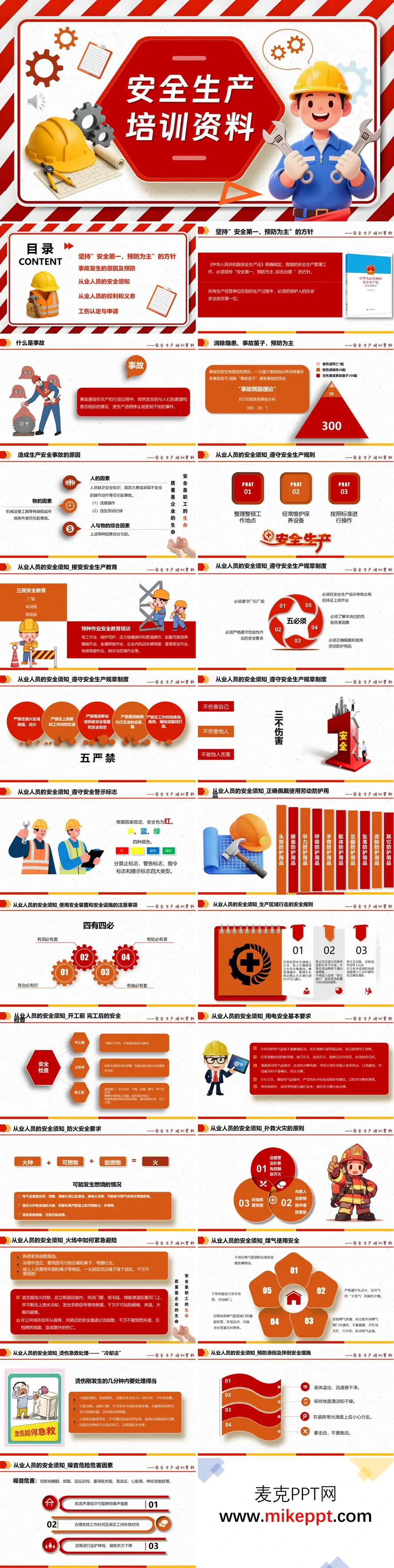 这套安全生产培训资料以“坚持安全第一,预防为主,综合治理”为方针,系统阐述了企业安全生产的多个关键方面。内容首先明确了事故的定义,强调事故是突发且违背意愿的事件,并借助“事故熊猫理论”说明事故的苗头性,指出每一起重大事故背后往往存在大量无伤害征兆,提醒人员重视隐患的早期识别与防控。 文档从多角度分析事故成因,涵盖人的不安全行为、物的不安全状态及人机综合因素,并重点提出从业人员的具体安全须知,包括遵守“五必须”“五严禁”等规章制度、正确使用劳动防护用品、落实“三不伤害”原则等。同时,资料详细列出从业人员在安全生产中的多项权利和义务,如知情权、紧急避险权、接受教育权等,并明确了工伤的认定标准与申请流程,强化了责任与法律意识。 在实操层面,资料涵盖了用电、防火、煤气使用、防烫伤、防滑倒等具体场景的安全措施,并介绍了事故急救方法。最后,资料强调安全生产管理需贯彻“谁主管谁负责”原则,通过标准化操作和风险预警机制,实现防微杜渐。整体内容结构清晰,注重预防与实操结合,突出“安全是效益”的核心价值观。