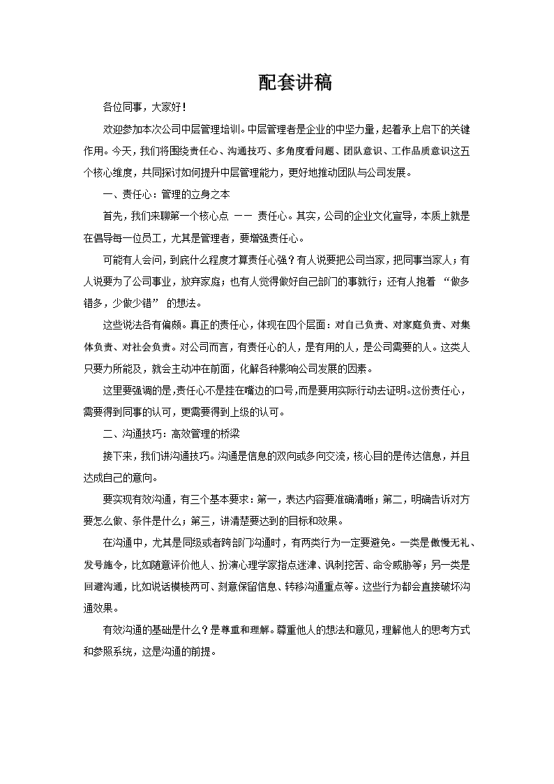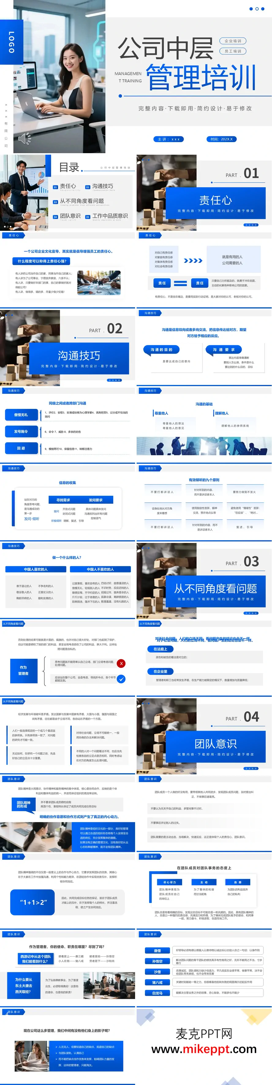 这套PPT是XXXX有限公司为中高层管理人员设计的培训材料,围绕五个核心主题展开:责任心、沟通技巧、多角度思考、团队意识和工作品质意识。内容结构清晰,强调实用性和可操作性,整体设计简洁明了,便于直接使用或调整修改。 培训首先强调“责任心”不仅是口号,更要通过实际行动体现,包括对个人、家庭、集体和社会的责任感,并指出公司需要的是主动担当、能化解问题的员工。在“沟通技巧”部分,重点介绍了尊重他人、积极倾听和有效提问的方法,避免傲慢、命令或回避等负面沟通方式,以达成协作共识。 此外,PPT还引导管理者“从不同角度看问题”,倡导超越部门立场,全盘考虑公司利益,通过协商寻找平衡点。“团队意识”部分以西游记团队为例,说明团队成员各司其职、优势互补的重要性,强调协同实现“1+1>2”的效应。最后,“工作中品质意识”要求管理者注重工作全流程的质量控制,主动解决问题,变被动为主动,体现管理者的担当与表率作用。 整体上,这份培训材料紧密结合企业管理实践,旨在提升中层的综合素养与团队领导力。
