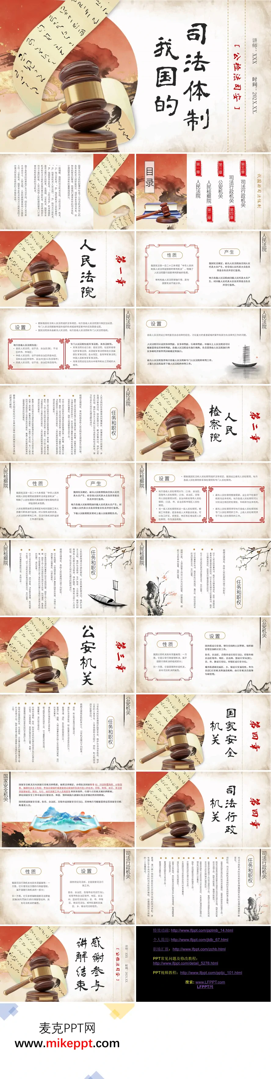 这份介绍我国司法体制的专题课件,以法槌、书法卷轴等极具象征意义的视觉元素为核心,整体采用复古雅致的暖色调设计风格,既彰显了法律工作的庄严权威,又融入了中国传统文化的厚重底蕴,营造出专业而不失人文气息的视觉氛围。 课件内容架构严谨,系统梳理了我国司法体系的核心构成,重点聚焦人民法院、人民检察院、公安机关、国家安全机关与司法行政机关五大职能主体。讲解维度清晰统一,从"性质定位"——明确各机关在国家权力结构中的根本属性;"产生方式"——阐释组织体系的产生途径与法律依据;"机构设置"——介绍各级组织的层级布局与地域分布;"任务与职权"——详述具体职能范围与权力运行机制,四个层面逐层深入、立体呈现。例如,深入解析人民法院作为审判机关的独立审判权,人民检察院作为法律监督机关的检察权与公诉职能,以及公安机关兼具行政与司法双重属性的侦查执法职责等核心内容,帮助受众准确把握各机关的职能边界与协作关系。 整份课件逻辑严密、层次分明,既宏观勾勒我国司法体制的整体框架,又微观细化各机关的具体权责与运作流程,兼具理论深度与实践价值,是开展法律知识普及、法治教育培训或相关法学课程教学的理想素材,能够有效助力受众构建对我国司法体系运行规律的系统认知。