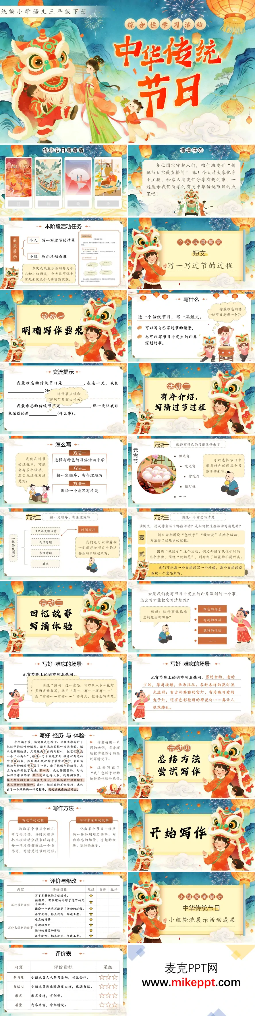 这是一份专为小学二年级下学期设计的《中华传统节日》语文综合学习课件,整体采用典雅的国潮美学风格,打造了一条从趣味导入到成果展示的完整学习路径。课件以"猜节日"的互动游戏开启课堂,营造悬念感与参与感;随后创设"国宝守护人"的沉浸式情境任务,将传统文化保护与节日探究巧妙结合,有效调动学生的表达热情。在写作教学环节,课件清晰界定"描写节日场景或讲述节日故事"的核心目标,并系统提炼三大写作策略:选取具有辨识度的节日习俗作为切入点,依照时间线索组织叙事顺序,围绕一个中心意思展开集中表达。通过元宵节赏灯、端午包粽等生动范例,引导学生运用固定句式渲染节日氛围,借助连贯的动词链呈现过节过程,捕捉个人独特的情感体验。课件还精心设计了当堂练笔环节,配套个人自评与小组互评的双重评价量规,从内容充实度、语言流畅度、表达感染力等维度全面评估。最后以荣誉奖状模板、活动回顾视频及优秀学生习作汇编作结,真正实现了"教—学—练—评"的一体化闭环,让学生在动笔实践中深化对传统节日的文化认同,同步提升叙事写作能力。