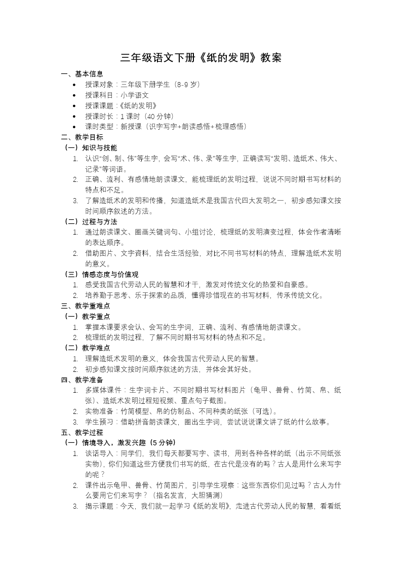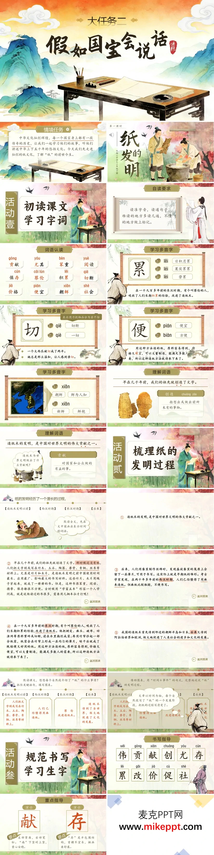 本课件围绕小学语文课文《纸的发明》展开教学设计,以"假如国宝会说话"为贯穿始终的情境线索,融合清新雅致的新国风插画视觉风格,构建起层层深入的教学架构。课堂起始的初读模块,紧扣"保存""蔡伦"等核心词汇及关键多音字进行夯实训练,为学生扫清阅读障碍。进入主体教学环节后,课件以时间为经纬,清晰勾勒出造纸术发展的历史图谱——从发明之前的甲骨、简牍、帛书等书写载体,到西汉时期麻纸的初步尝试,再到东汉蔡伦系统改进造纸工艺,直至这项技术远播世界的完整历程,借助可视化图表与文本互释,帮助学生建立清晰的历史认知链条。教学过程中适时嵌入书写指导微板块,对"录""存"等典型生字进行笔顺拆解与结构分析;同时创设材料对比探究活动,引导学生从价格、重量、易得性等维度比较龟甲、竹简、丝帛与纸张的差异,在实证比较中深刻领悟蔡伦造纸术的科学价值与革新意义。课堂尾声设置开放性拓展任务,鼓励学生搜集资料探究造纸术对全球文明进程的推动作用,配合结构化的课堂小结与多维评价量表,最终达成语言建构、思维发展与文化自信培育的三重教学目标,让学生在触摸历史温度的过程中,感受中国古代科技智慧对世界文明的深远贡献。