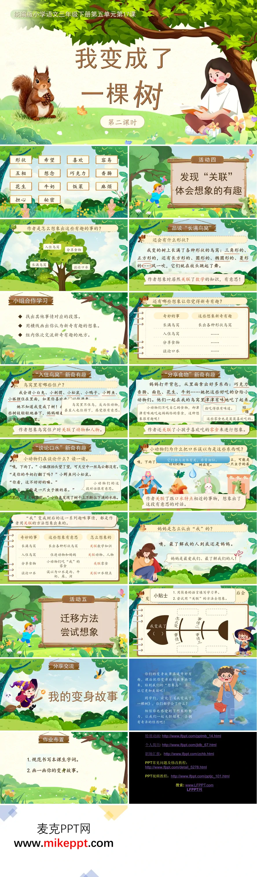 这是一套专为小学语文三年级下册《我变成了一棵树》第二课时精心设计的教学课件,以"发现关联,解锁想象"为核心教学理念,通过层层递进的教学活动,引导学生在文本细读中发现想象的密码,在方法迁移中创造自己的想象世界,同时深化对亲情主题的理解与感悟。 课件开篇首先系统梳理本课生字词,通过认读、组词、造句等方式巩固"痒痒的""鳄鱼""香肠""糖醋排骨"等词语,夯实语言基础,为后续深入研读扫清障碍。随后迅速聚焦核心教学活动"发现关联,体会想象的有趣",带领学生走进作者顾鹰构建的奇妙世界。 在"品读'长满鸟窝'片段"环节,课件引导学生关注作者独特的想象路径——当"我"变成一棵树后,树上长满了各种形状的鸟窝。学生通过细读文本发现,这些鸟窝的形状并非随意编造,而是巧妙地关联了数学知识:三角形、正方形、长方形、圆形、椭圆形、菱形……作者将课堂所学的几何图形知识迁移到想象创作中,让鸟窝既新奇有趣又合情合理。这一发现环节让学生初步感知"关联"这一想象方法的奥秘。 随后开展小组合作学习,梳理后续情节中的想象逻辑。在"入住鸟窝"情节中,作者关联了动物习性(小兔、小刺猬、小松鼠等小动物喜欢住在树上)与人物关系(妈妈、小动物们成为邻居);在"分享食物"情节中,关联了零食特点(巧克力、香肠、面包等)与分享场景;在"谈论口水"情节中,更是巧妙地将"我"馋得流口水的生理特点,与大树下雨、牛奶打翻等事物特征相关联,创造出令人捧腹又赞叹的想象效果。通过合作探究,学生逐步提炼出作者的想象密码:想象不是凭空乱想,而是建立事物之间的巧妙关联,让想象既大胆新奇又逻辑自洽。 情感升华环节聚焦核心问题"妈妈如何认出我"。课件引导学生关注细节描写:妈妈明明知道"我"变成了树,却故意不拆穿,而是带着好吃的坐在鸟窝里,用"小馋猫,肚子饿了,对吧?""对我眨了一下眼睛"等方式温柔地关爱着"我"。这一设计让学生在恍然大悟中体会母爱的细腻与智慧,点明"无论我变成什么,妈妈总能找到我、爱我"的亲情主题,使想象故事有了温暖的情感底色。 "迁移方法,尝试想象"环节实现了从阅读理解到创作实践的能力转化。课件借助思维导图学习支架,引导学生运用刚刚习得的"关联"法构思自己的变身故事:想变成什么?关联什么知识或特点?会发生什么有趣的事?学生在支架支持下完成口头创作,并在小组内分享交流,互相启发,将课堂所学即时转化为表达能力。 最后的作业设计体现了分层与融合的理念。基础作业要求规范书写本课生字词,巩固语文基础;拓展作业鼓励学生用画笔描绘出自己的变身故事,将文字想象转化为视觉形象,实现跨学科融合。整套课件让学生在探究中发现方法,在创作中感受魅力,在分享中体验成功,充分体现了想象类文本教学"读中发现—悟中习得—用中创造"的教学规律。